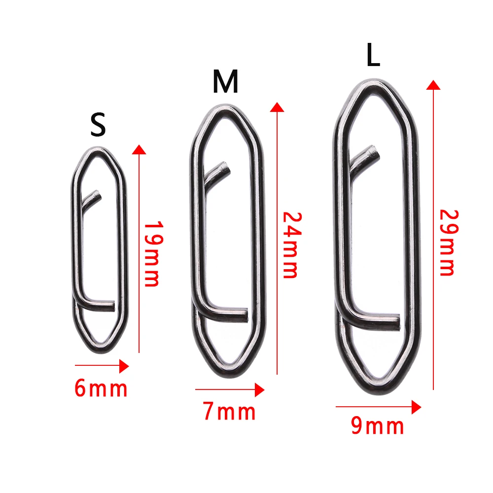 Тип: Рыболовная Снасть Материал: нержавеющая сталь Размер: S, M, L Длина: 19 мм/24 мм/29 мм Ширина: 6 мм/7 мм/9 мм Посылка включает в себя: 50 шт. рыболовных подвесных защелок