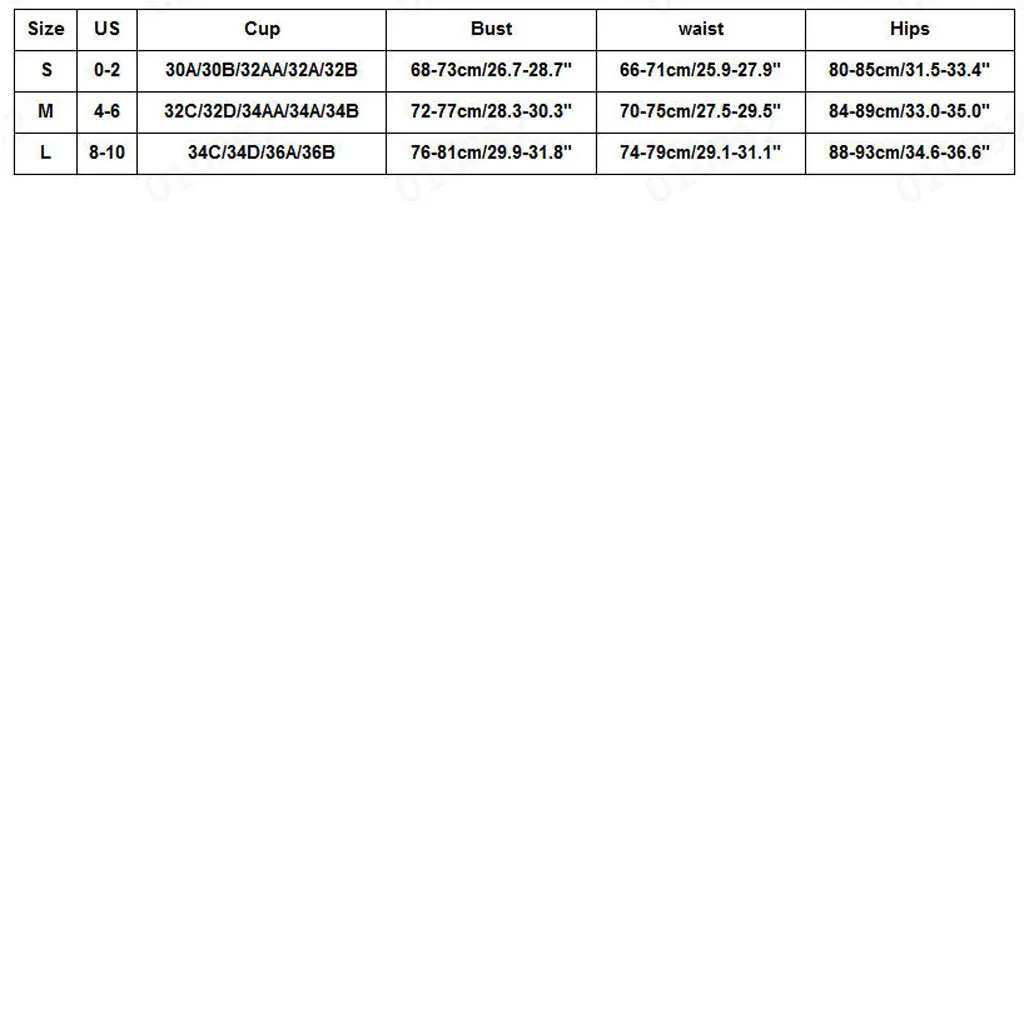 Примечание: Пожалуйста, сравните детали размеров с вашими перед покупкой! Используйте аналогичную одежду, чтобы сравнить с размеромРазмер США Чашка Бюст Талия Бедра S 0-2 30A/30B/32AA/32A/32B 68-73 см/26,7-28,7" 66-71 см/25,9-27,9" 80-85 см/31,5-33,4" М 4-6 32C/32D/34AA/34A/34B 72-77 см/28,3-30,3" 70-75 см/27,5-29,5" 84-89 см/33,0-35,0" L 8-10 34C/34D/36A/36B 76-81 см/29,9-31,8" 74-79 см/29,1-31,1" 88-93 см/34,6-36,6"