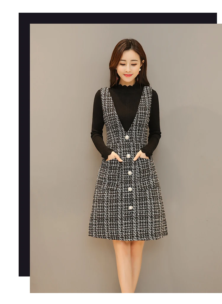 Весенние, Осенние, зимние женские костюмы, плюс размер, свитер, сарафан, сказочные сны, комплекты из двух предметов, вязаный черный топ и шерстяное платье DG116