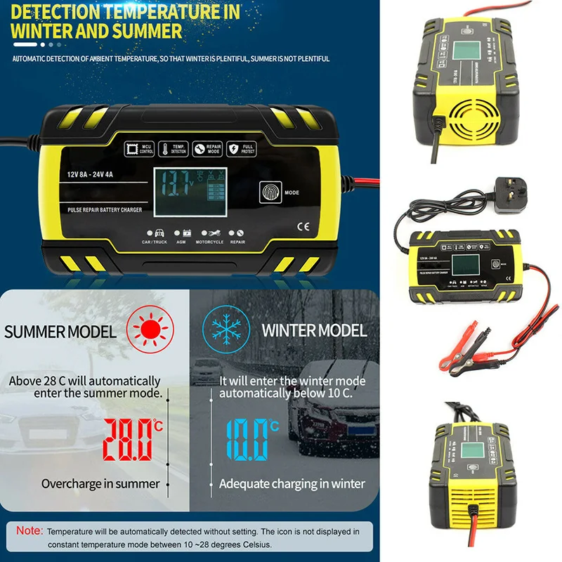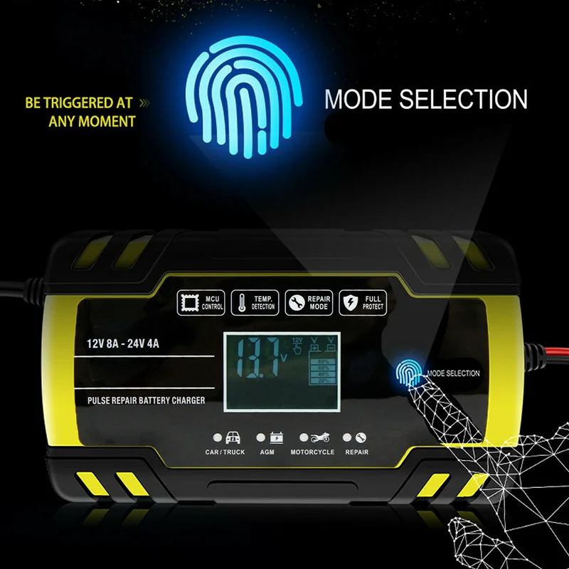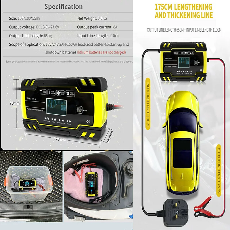 ЭтоУмное 6-150AH 12V 24V 4A 8A свинцово-Кислотное зарядное устройствоИдеальный аксессуар для зарядки свинцово-кислотных аккумуляторов вашего автомобиля, включая кальций, гель, AGM,EFB, SLA, Влажные батареи безопасным и простым способом. Это зарядное устройство использует 3 этапа зарядки системыПостоянный ток, Постоянное напряжение, ЗатемЗарядное устройство. Постоянный ток с меньшим количеством тепла защищает батарею и остается в безопасности при оставлении ее для зарядки. Интегрированный Датчик позволяет полностью видеть, сколько энергии используется, и специальная функция защиты безопасности обеспечивает ваше спокойствие.