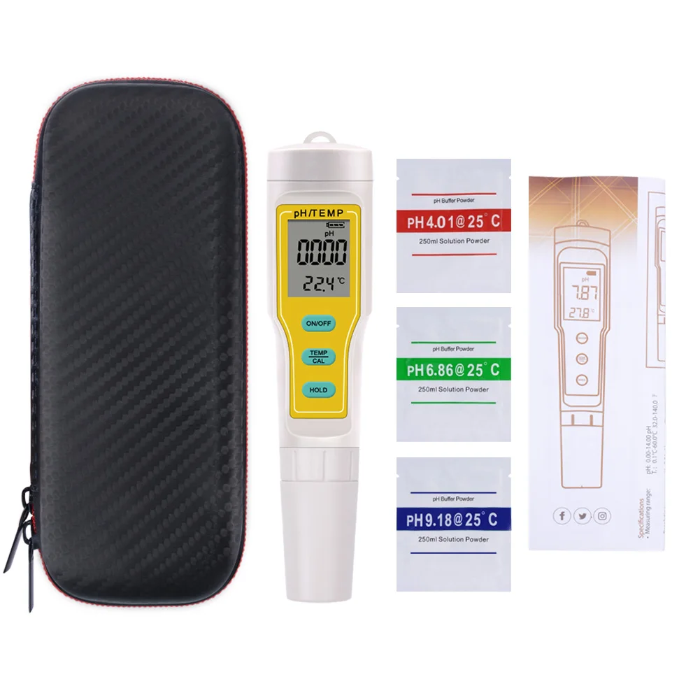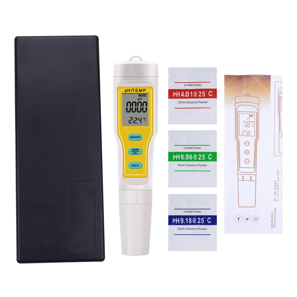 Дисплей: цифровой ЖК-дисплей Точность: 0,01 Разрешение: 0,01 Рабочая температура: 0 ~ 60 °C Диапазон измерения: 0,00 ~ 14,00 Время в режиме ожидания: около 2000 часов Содержимое дисплея: мощность, PH, температура Тип зонда: стеклянный электрод Питание: 3*1,5 V батареи