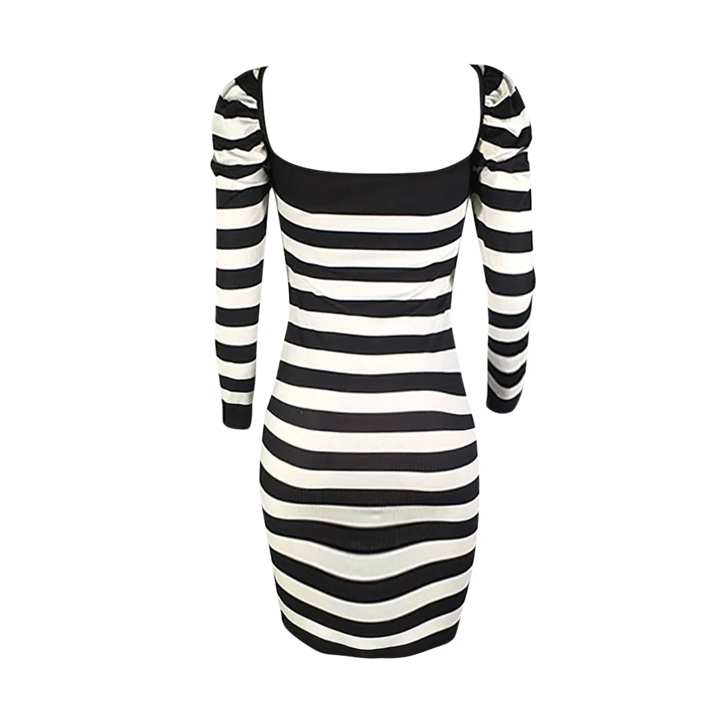 Женское модное сексуальное платье до колена с квадратным воротником и принтом в полоску с длинным рукавом