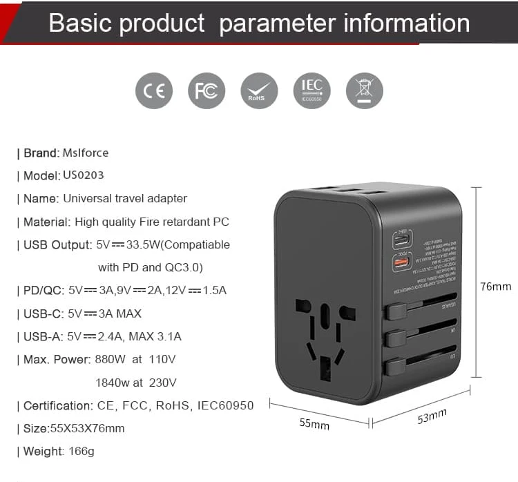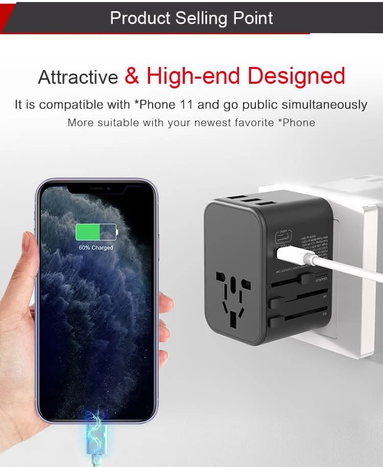 Оснащен 1 универсальным входом + 1 PD/QC 3,0 портом и 1 USB Type C + 3 USB (2.4A)-идеально подходит для путешествий-используйте с сотовыми телефонами, iphone, планшетами, Ipad, ноутбуки и другие устройства в любой точке мира.