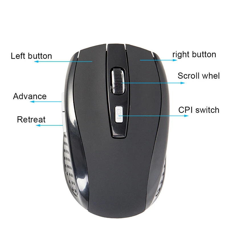 Особенности: -- Изготовлен из экологически чистого материала, высокого качества, удобен в использовании. -- 2,4 ГГц Беспроводная передача, до 10 метров рабочего расстояния. -Наслаждайтесь скольжением по столу без использования коврика для мыши с этой беспроводной оптической мышью. -С 2 клавишами, включая колесо прокрутки, кнопки «Вперед» и «назад» для удобного интернет-серфинга. -Его можно использовать практически на любой поверхности, потому что он использует датчики для записи движения оптически. Описание: Тип товара: Беспроводная оптическая мышь Цвет: черный, серебристый, серый, красный Размер usb-приемника: 18x14x5 мм Мощность: 2 батареи AAA (не входит в комплект) Посылка включает в себя: 1 х Беспроводная оптическая мышь 1 х USB получать