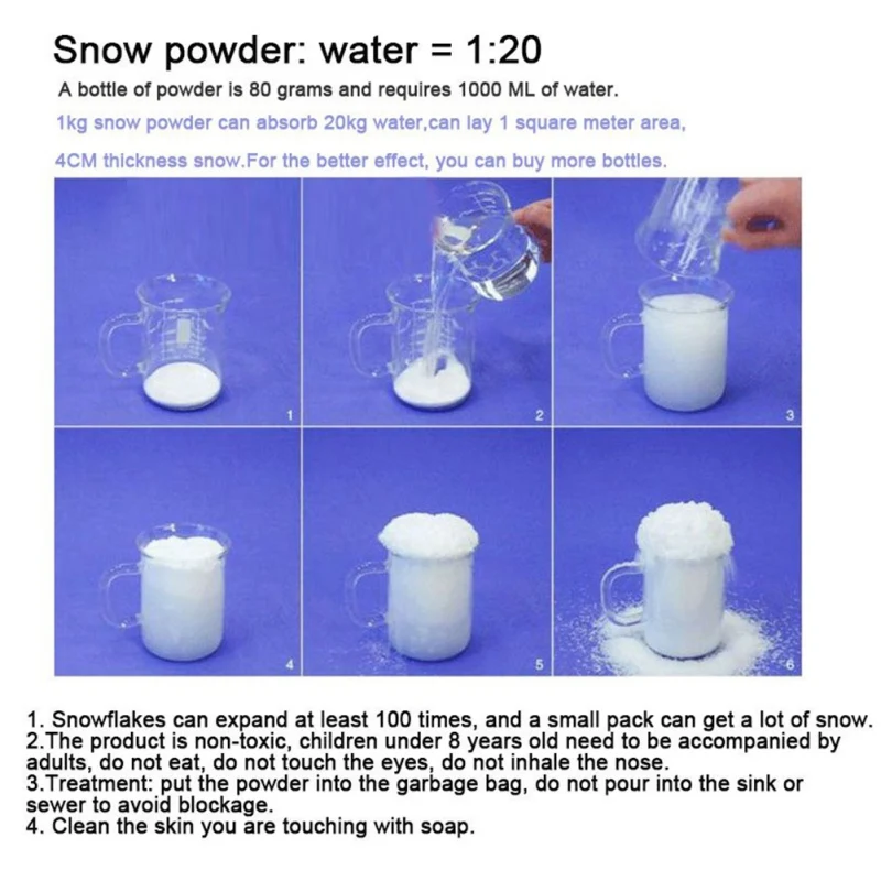 Особенности: Наименование: искусственный снег Материал: водопоглощающая смола Размеры: 9*5*5 см Цвет: как на картинке Количество: 1 шт. Описание: 1. Этот порошок может немедленно переключиться в снег, когда он соприкасается с водой. Соотношение воды и порошка обычно составляет 20: 1, что составляет 50 граммов бутылки порошка в нашем магазине. В основном, он оснащен 1000 мл воды. 2. Снежинки могут расширяться не менее 100 раз, и небольшая посылка может получить много снега. 3. Продукт безопасен и не токсичен. Дети до 8 лет должны сопровождать взрослых. Не ешьте, не прикасайтесь к глаза, не дышать носочной части. 4. Обработка: Положите порошок в мешок для мусора, не вылейте его в раковину или канализацию, чтобы избежать закупорки. 5. Очистите кожу, которую вы трогаете мылом. Посылка содержание: 1 * искусственный снег