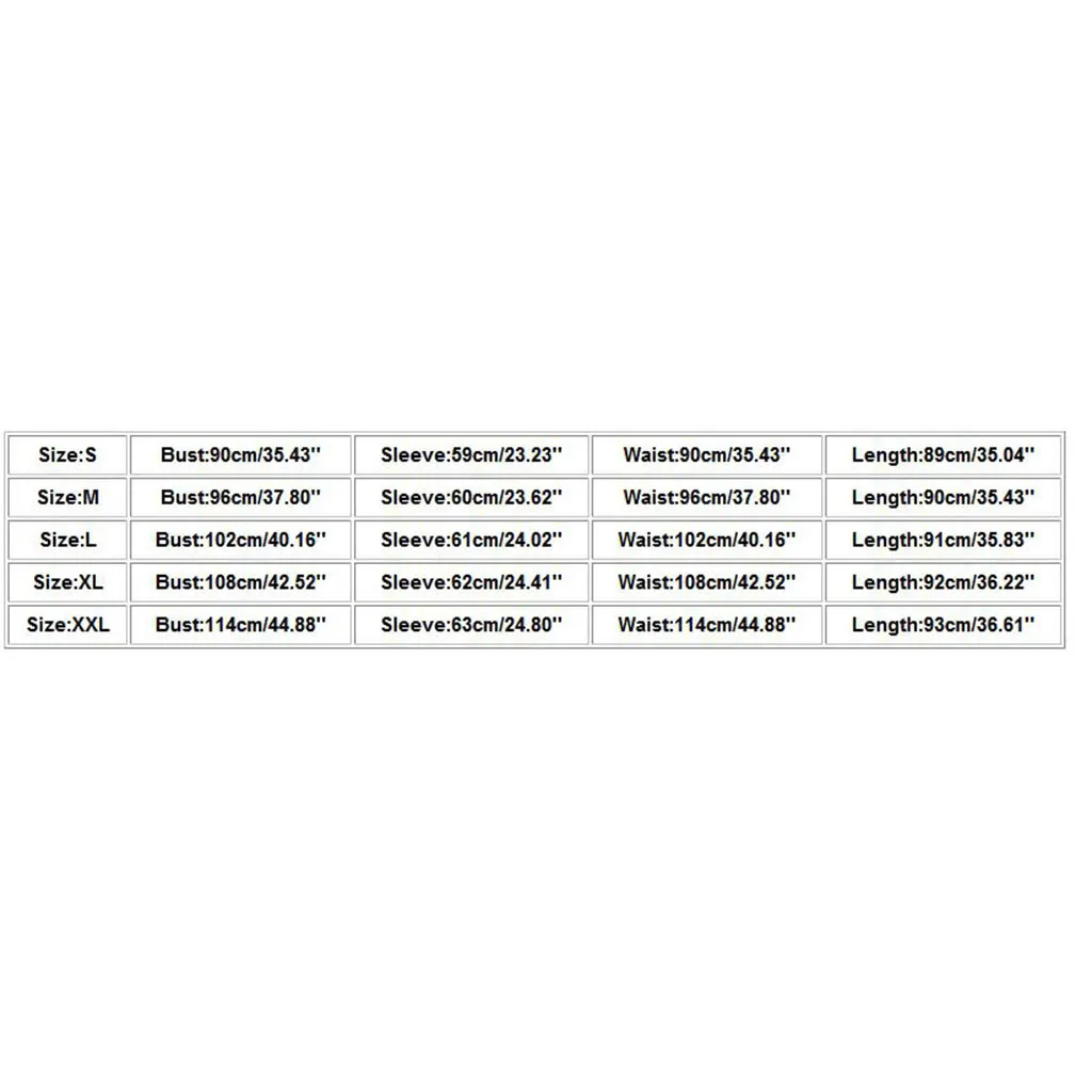 Размер Обхват груди Рукава Обхват талии Длина S 90 см/35,43'' 59 см/23,23'' 90 см/35,43'' 89 см/35,04'' М 96 см/37,80'' 60 см/23,62'' 96 см/37,80'' 90 см/35,43'' L 102 см/40,16'' 61 см/24,02'' 102 см/40,16'' 91 см/35,83'' XL 108 см/42,52'' 62 см/24,41'' 108 см/42,52'' 92 см/36,22'' XXL 114 см/44,88'' 63 см/24,80'' 114 см/44,88'' 93 см/36,61''