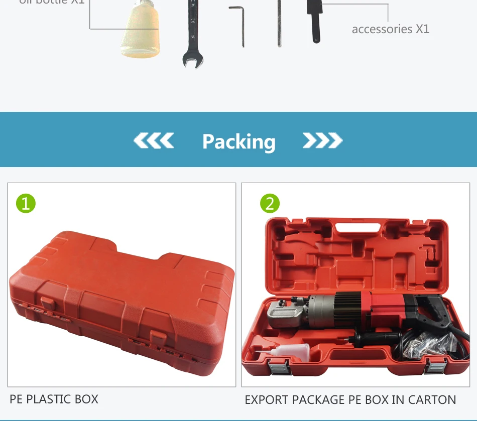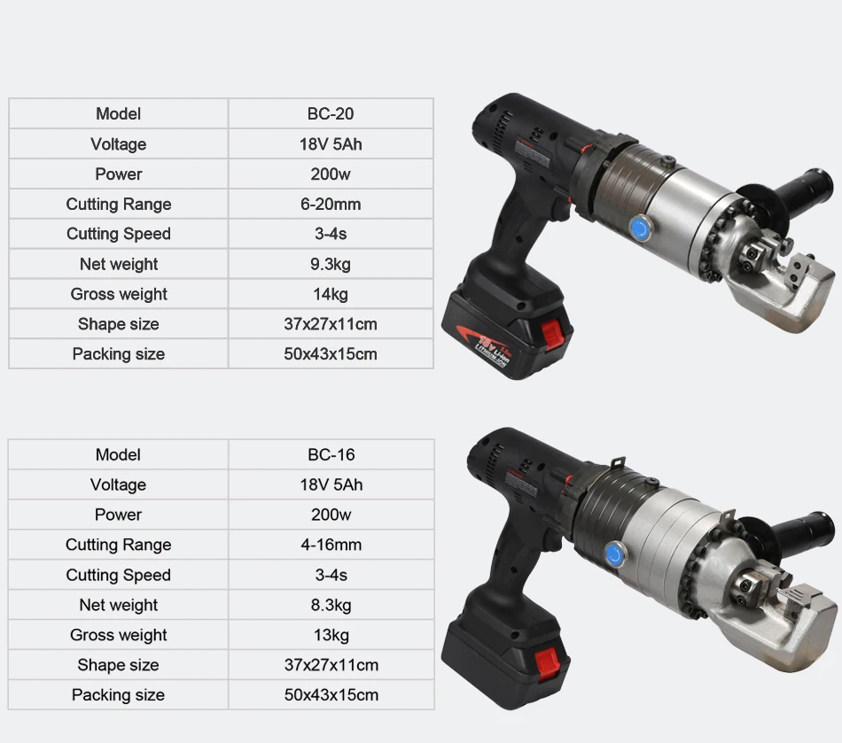 S.Q модель RC-16 1 Мощность 950 Вт 2 Напряжение 220V/50 Гц 110 В/60 Гц 3 Диапазон резки 4-26 мм 4 нетто. Вес 8,15 кг 5 брутто. Вес 12,2 кг 6 размер упаковки 51.5X13X22.5cm Пожалуйста, обратите внимание на цвет товара 1. Доступная модель: RC-16, RC-20, RC-22, RC-25, RC-16B, NRC-20 2. Доступный Сертификат: CE, RoHS 3. Упаковка: один комплект/металлическая коробка/коробка 4. Подробное описание гидравлической арматуры для резки (Reabr резак): арматура резак (RC), портативный Электрический гидравлический арматурный резак-это своего рода светильник, маленький, портативный и тихий резец арматуры, он прост в эксплуатации и безопасен для пользователей, как резка без искры, осадка и запаха. Он широко используется для резки строительных стержней, деформированных стержней, круглых стальных стержней, стальных стержней и резьбовых стержней и т. д.