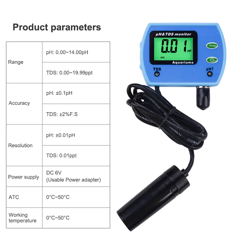 Диапазон: pH: 0,00 ~ 14.00pH TDS: 0,00 ~ 19.99ppt Разрешение: pH: 0.01pH TDS: 0.01ppt Точность: pH: ± 0.1pH TDS:± 2% f. S Компенсация температуры: 0 °C ~ 50 °C (32 °F ~ 122 °F) Рабочая температура: 0 °C ~ 50 °C (32 °F ~ 122 °F) Длина TDS электродный линейный: прибл. 113 см/44.5in Длина pH электрода: прибл. 118 см/46.5in Источник питания: 6 В постоянного тока (адаптер питания можно использовать) Батарея: 4 × 1,5 V ag-13-ти таблеточная батарейка батареи (не входит в комплект) Цвет: синий Материал: АБС-пластик Размер изделия: прибл. 7,5*6,7*2,5 см/2,9*2,6 * 1.0in (за исключением TDS электрода) Вес изделия: прибл. 99,8g/3,5 oz (2 в 1 метр тела) Размер посылка: прибл. 21*10,4*5 см/8,3*4,1 * 1.9in Вес посылка: прибл. 346g/12,2 oz