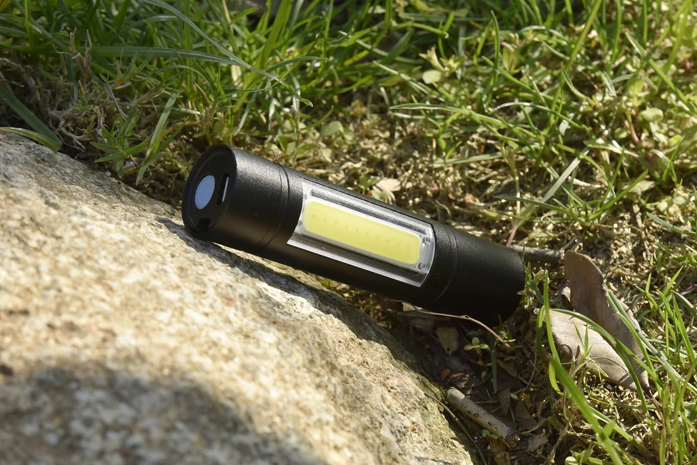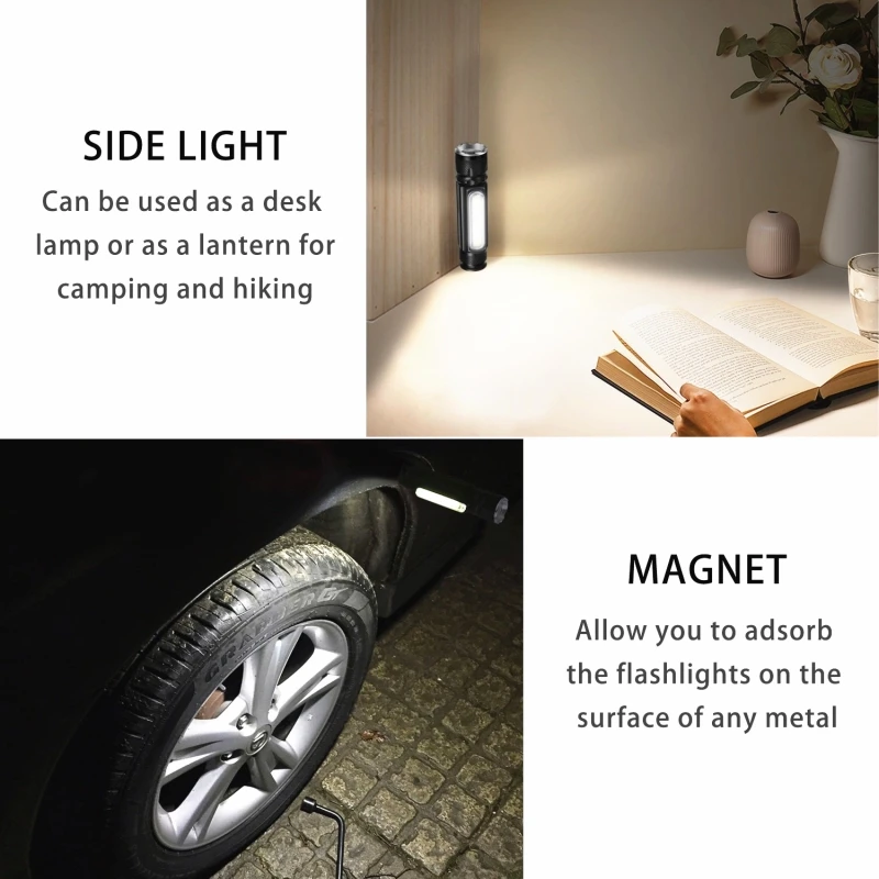 На боковой панели флеш-светильник разработан с COB лампа из бусин, который может использоваться как наводнение светильник s, кемпинга, светильник, светильник ing, светильник мягче.