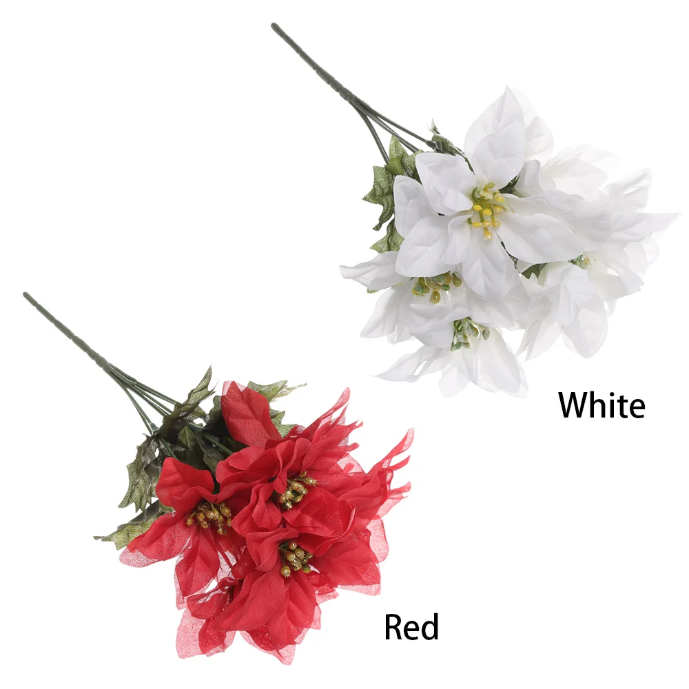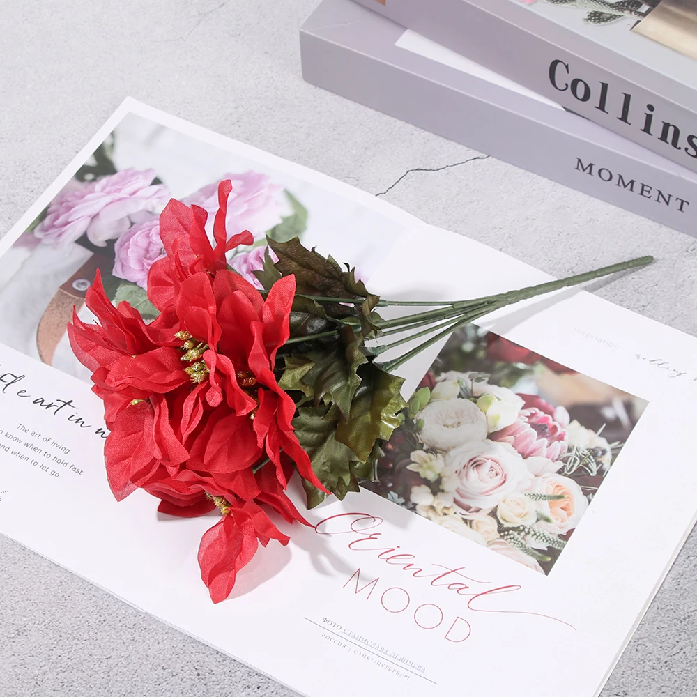 7 головок/букет, настоящие на ощупь, фланелевые Искусственные Рождественские цветы, красные кусты пуансеттия, букеты, украшения на елку, центральная часть