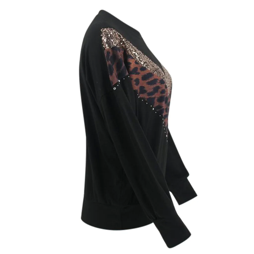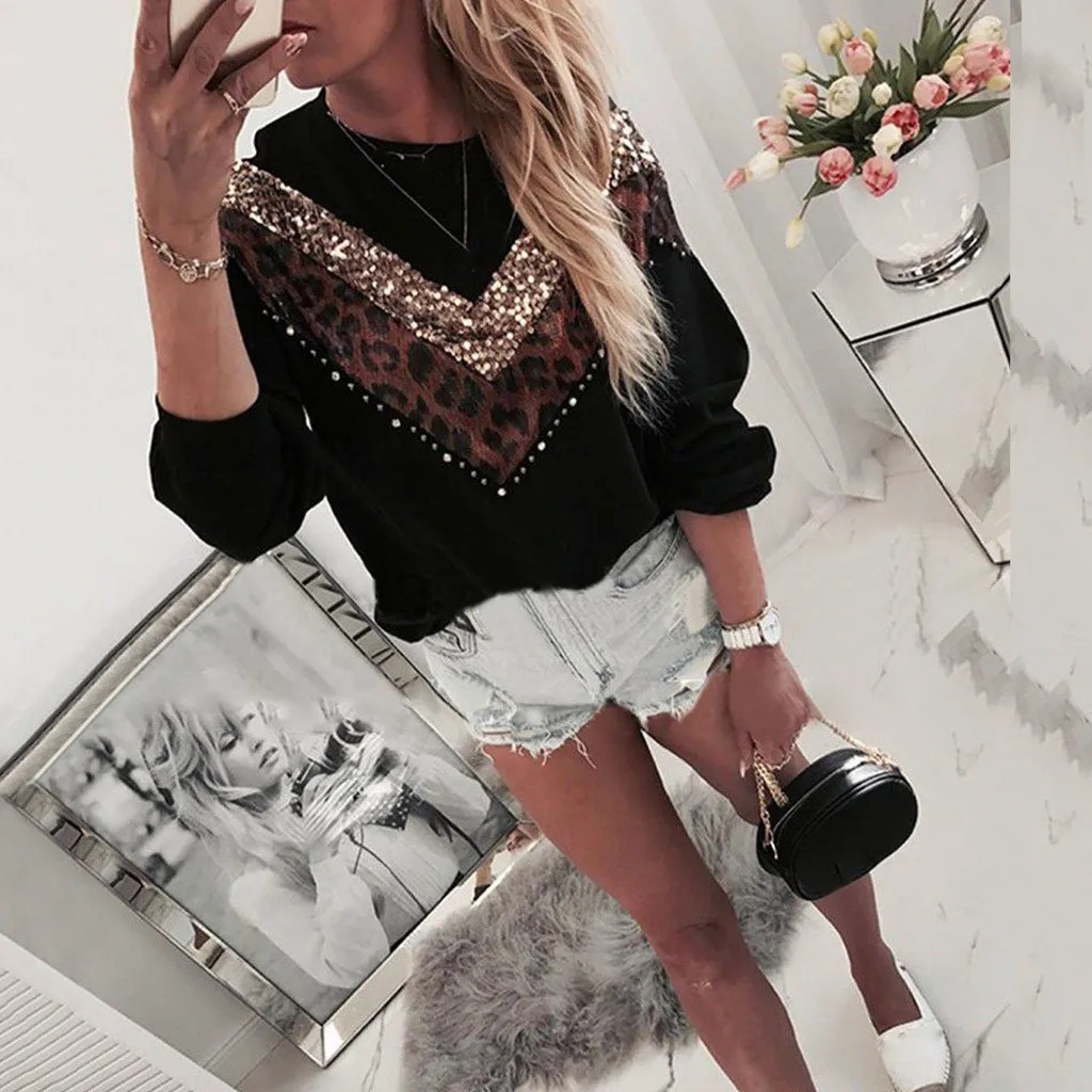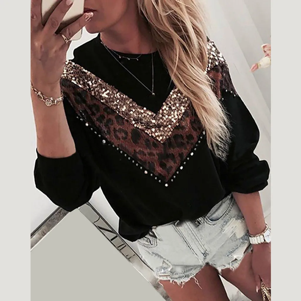 Женская мода с блестками Леопард сшивание с длинным рукавом Круглый вырез свитер Топ