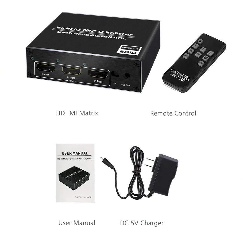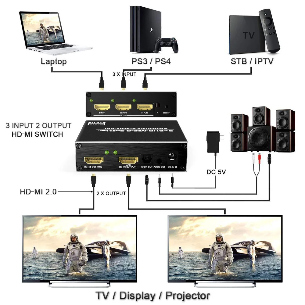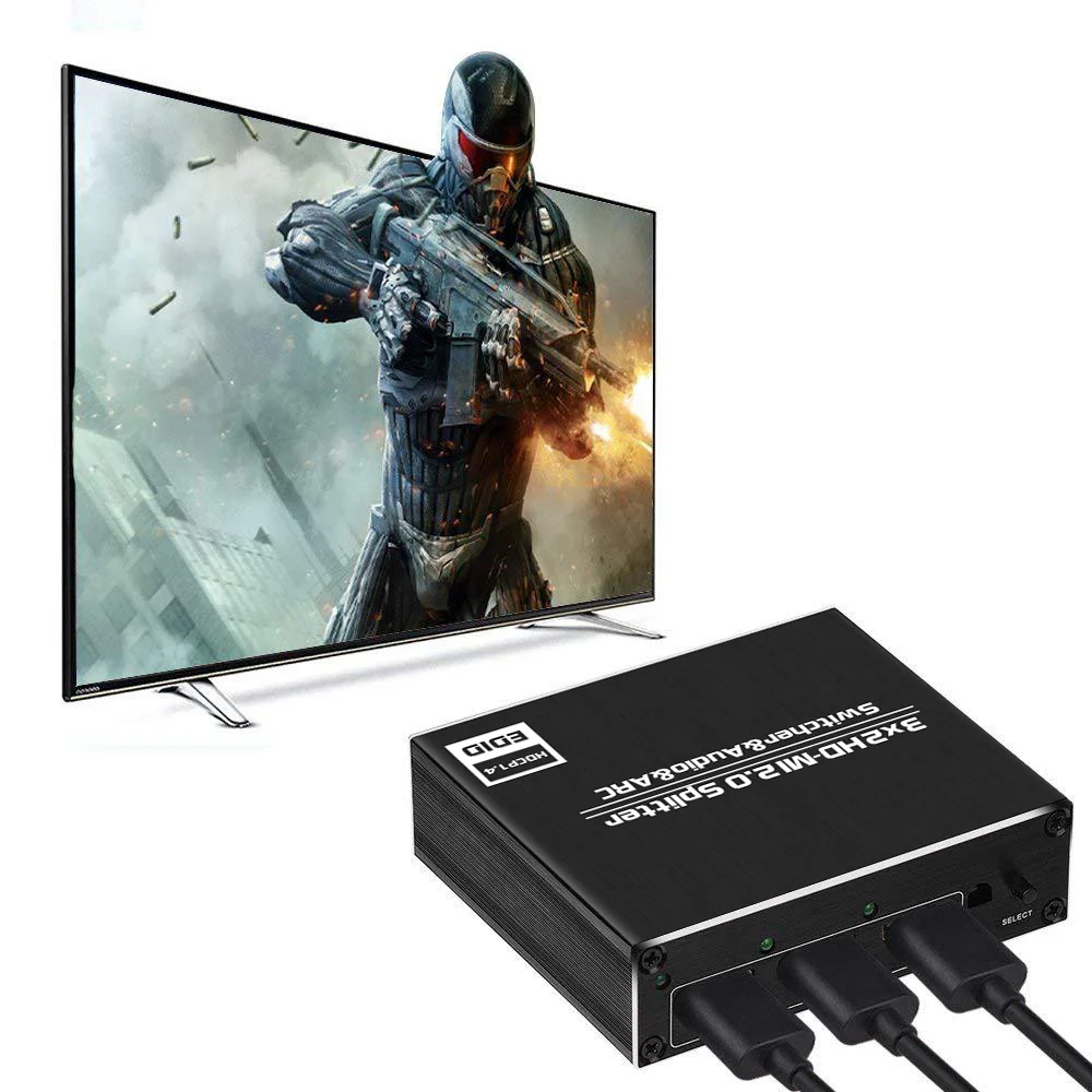 Это 3-вход и 2 выхода переключатель компонентов. Вы можете одновременно выводить одно изображение/звук трех HD-MI машин на два дисплея. Примечание: Этот продукт не является матричным переключателем. 2 выходной порт не может выводить различные изображения. Особенности: 1. Поддерживает функцию HDCP 1,4/HDR в ответ на сверхвысокое Видение 4K x 2K / 60Hz. Он может выводить видео высокого качества и хорошо работает в музеях и телевизионных магазинах. 2. Вы можете наслаждаться звуком высококачественной аудиосистемы, такой как LPCM 7,1/DOLBY-AC 3 с оптической изоляцией, оптическим цифровым терминалом, выходным терминалом RCA. 3. Совместимые модели: smart TV, такие как Fire TV / Apple TV / SONY TV, Blu-ray / DVD / PC, PS4 Pro, Nintendo Switch и другие игровые консоли 4. С пультом дистанционного управления, вы можете легко переключаться с расстояния