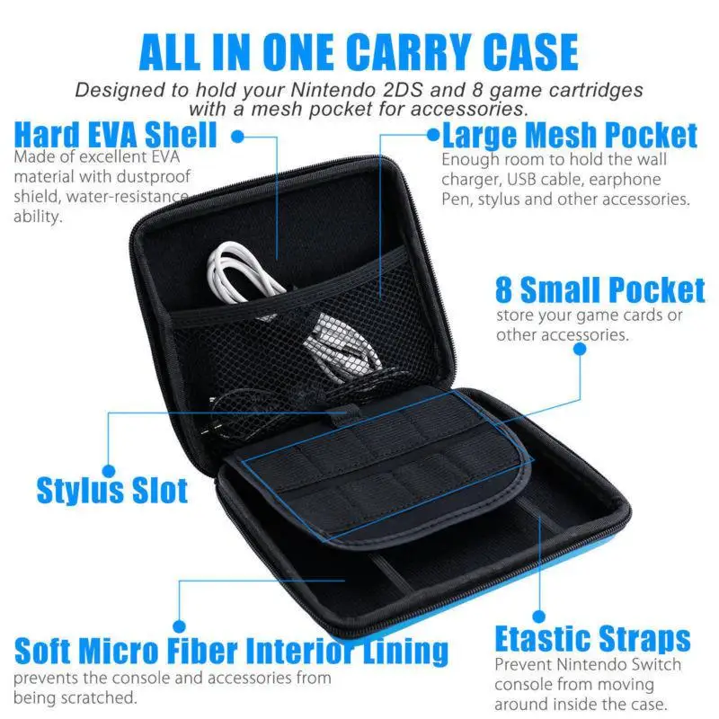 Прецизионный дизайн и эластичные ремни надежно удерживают консоль 2DS на месте и не позволяют ей перемещаться внутри чехол.