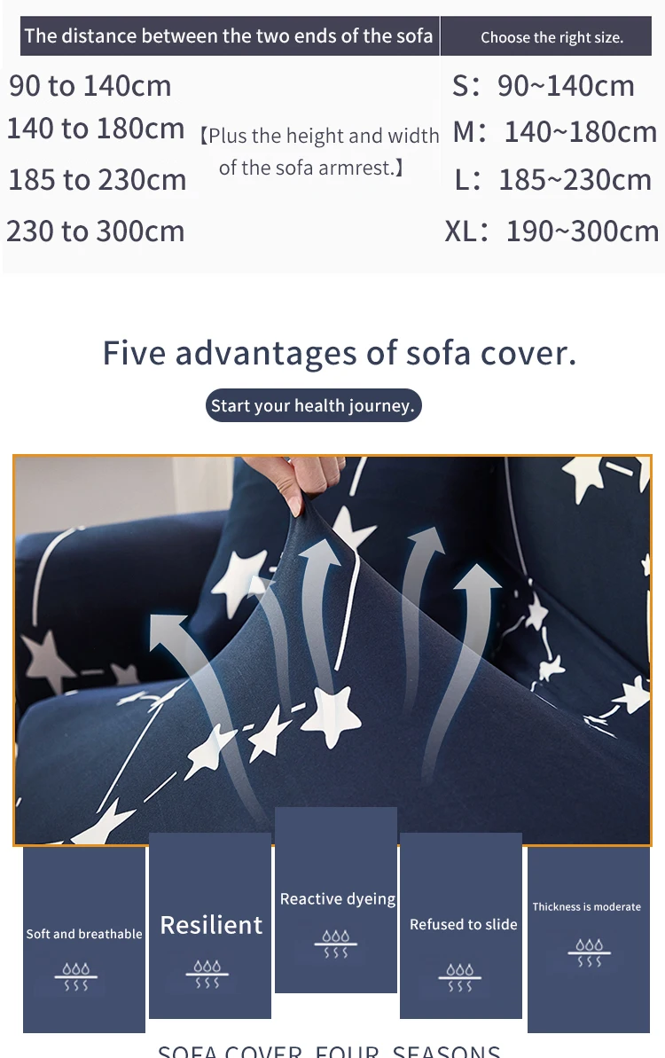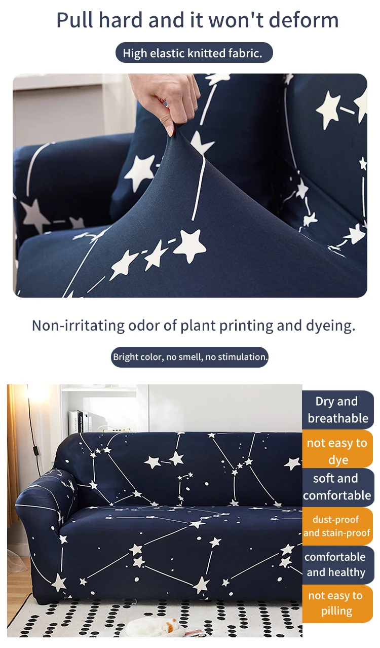 1. Отобранные качественные ткани, диван и удобные, высокая эластичность, дышащий, прочный 2. Он изготовлен из эластичного материала, отлично подходит для большинства дивана 3. Активная технология печати и окрашивания; Не вредит здоровью, Экологически чистая, не поддаётся выцветанию 4. Легко установить и разделение, просто чехол для дивана и вставной поролон бары в диван gap, Превратите свои старые дивана в новую за считанные минуты. 5. Защитите ваш диван от пятен, шерсти домашних животных, повреждений и пыли 6. Доступны в 4 различных размеров, много цветов на выбор 7. Подходит для дома, отеля и офиса и любую потребность диван место