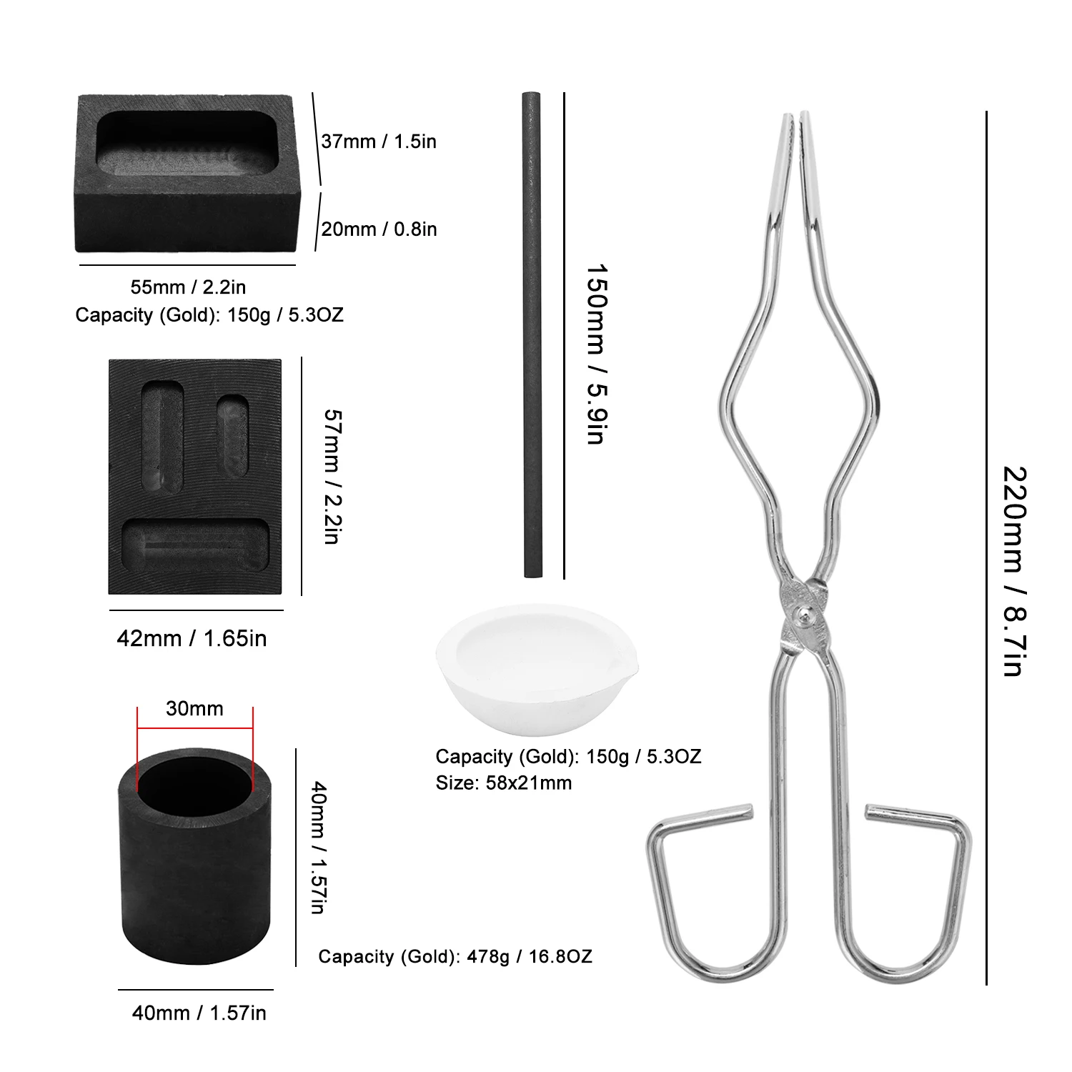 Шесть штук в наборе, включая тигель, щипцы, корыто, графитовый помешивающий стержень, прямоугольный графитовый тигель и цилиндрический графитовый тигель.