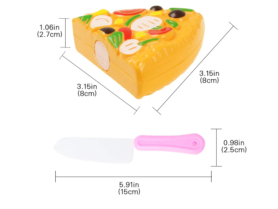 Рекомендуемый возраст: 3 + лет Материал: Пластик Размеры: app.16.5cm/6,5'' Цвет: как на картинке Количество: 1 пицца (6 шт.) + 1 нож