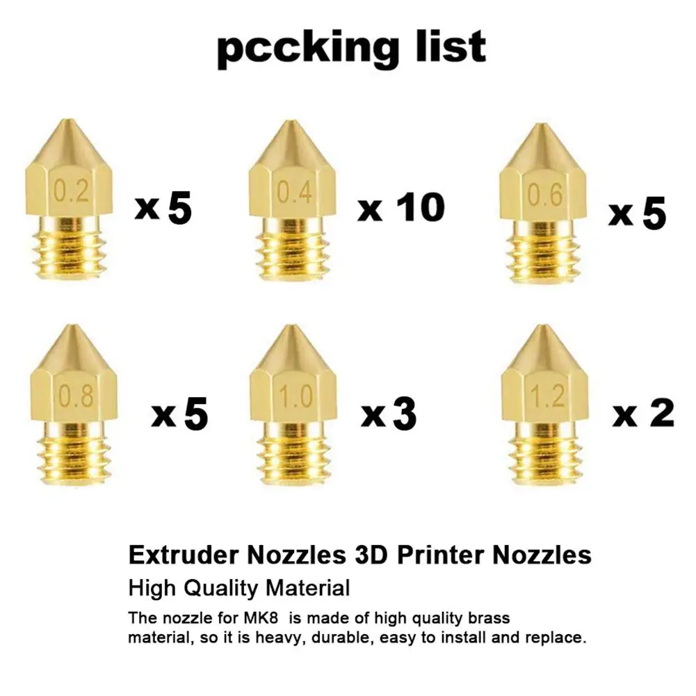 1. Высококачественный материал: насадка для MK8 изготовлена из высококачественного латунного материала, поэтому она тяжелая, прочная, легко устанавливается и заменяется.2*1,2 мм Насадка для печати