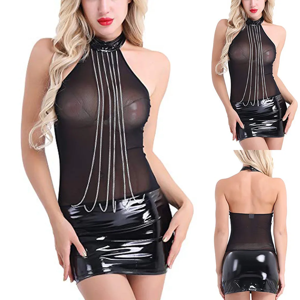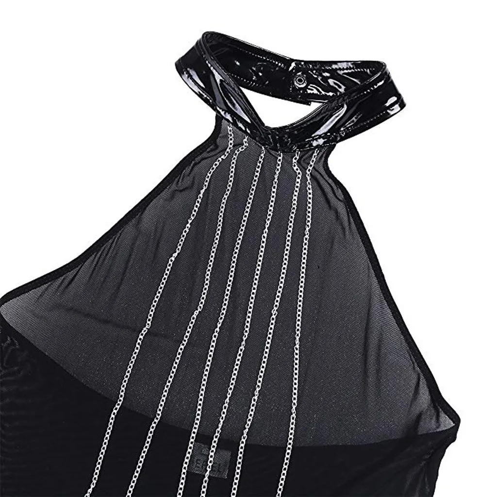Женское сексуальное нижнее белье из лакированной кожи с цепочкой и воротником