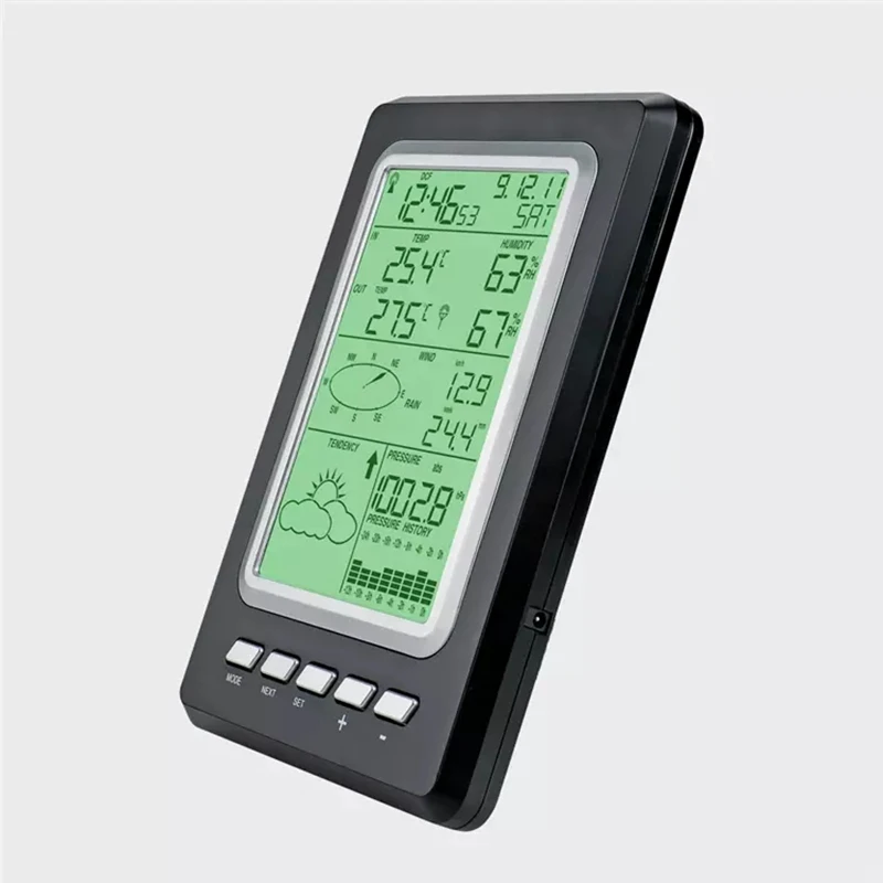 Будильник с информацией о погоде режимов для температуры, влажности, холода ветра, точки росы, осадков, скорости ветра, давления воздуха, предупреждения шторма.