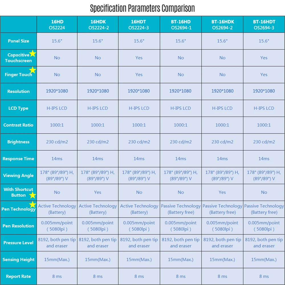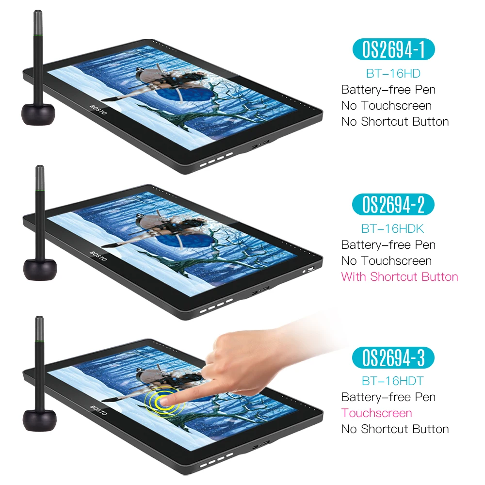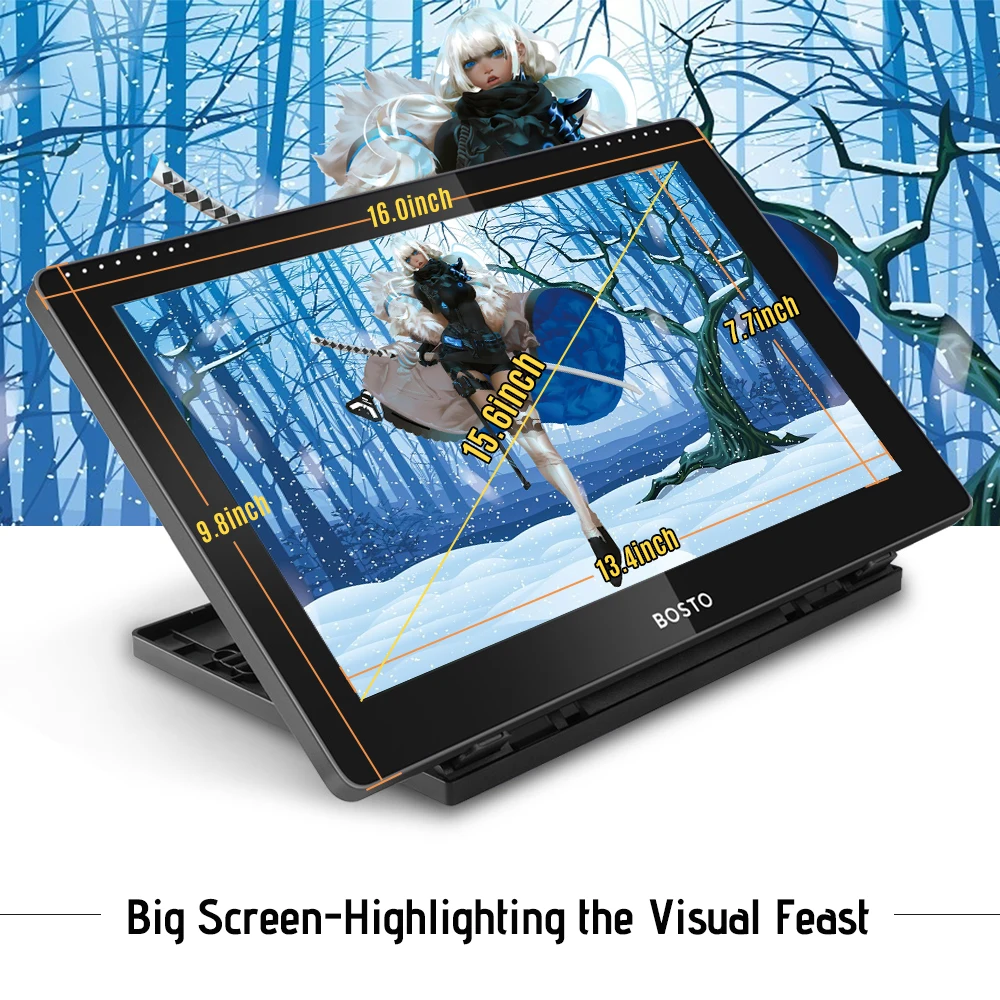 Марка: BOSTO Модель: 16HD/16HDK/16HDT/BT-16HD/BT-16HDK/BT-16HDT Активная площадь экрана: диагональ 15,6 дюйма, 34,5 * 19,5 см / 13,4 * 7,7 дюйма (Д * Ш) Режим ЖК-дисплея: ЖК-экран H-IPS Собственное разрешение: 1920 * 1080 Коэффициент контрастности: 1000: 1 Соотношение сторон: 16: 9 Цвет дисплея: 16,7 миллионов цветов (262K) Гамма: 75% Adobe RGB Технология: электромагнитная индукция Яркость: 250 кд / ㎡ Разрешение экрана: 5080LPI Частота ответов: 8 мс Подключение: TYPE-C + HD-IN Переключатель конвертер: подключи и играй Направление: правша или левша Уровень давления: 8192 Уровень Высота чтения: Макс. 15 мм Скорость чтения: 266 баллов в секунду Угол обзора: 178 °; (89 ° / 89 ° H, 89 ° / 89 ° V) Ручка: активная электромагнитная ручка (модель: B08) Встроенная ручка батареи: 80 мАч Время зарядки пера: 5 минут Диапазон наклона: 45 & deg; Потребляемая мощность экрана: 5 Вт Входное напряжение: 5 В Валюта: 0,6 мА Видеовход: HD-IN + USB 2-1 линия Поддерживаемая система: все системы выше Win7, & nbsp; и Mac OS 10, 11 или выше. Совместимое программное обеспечение: Adobe Photoshop , Illustrator , Corel Painter , SketchBook , 3ds Max , Maya , ZBrush , Mudbox, Toon Boom Studio , Clipstudio / Mangastudio , Artrage, Easy Paint Tool SAI, GIMP, Krita, Flipbook , Premier Pro CC , Flash, FireAl , Smooth Draw, Adobe Creative Cloud, Fresh Paint / Paint 3D / Office / One, заметки, концепции, эскизы и т. Д. Регулируемая подставка: пластик, класс 6, 10 °; - 85 ° Размер подставки (Д * Ш): 29,7 * 21 м / 11,7 * 8,3 дюйма Размер элемента: 40,5 * 25 * 1,9 см / 16 * 9,8 * 0,75 дюйма Вес изделия: 1,4 кг / 3,1 фунта Размер упаковки: 44 * 29 * 5,8 см / 17,3 * 11,4 * 2,3 дюйма Вес упаковки: 3310 г / 7,3 фунта