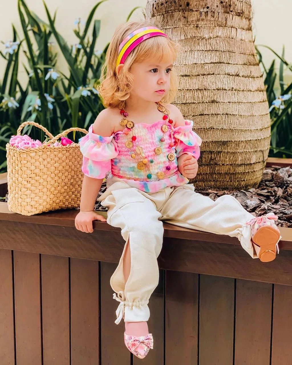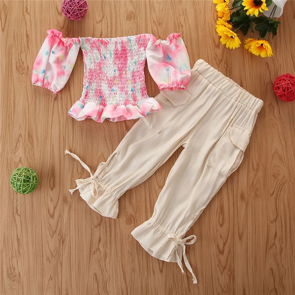 Топы с открытыми плечами и цветочным принтом для маленьких девочек + штаны, комплекты одежды детская модная летняя одежда с короткими рукавами и открытыми плечами