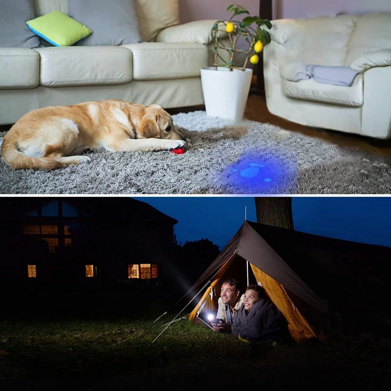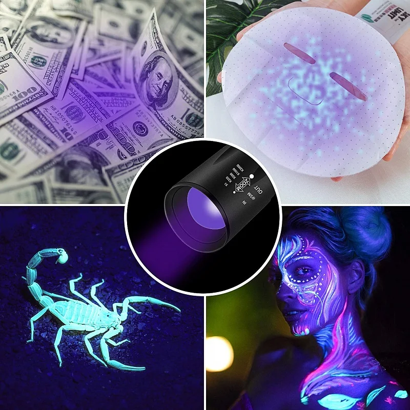 【UV torch】этот UV светильник с длиной волны 395nm черный светильник, так ярче с довольно сфокусированным выходом. Идеально подходит для обнаружения банкнот, мочи домашних животных, скорпионов и пятен, которые не видны невооруженным глазом. Этот УФ-Фонарик поможет вам найти ФЛУОРЕСЦЕНТНОЕ Отбеливающее вещество, которое содержится в детской одежде или вашей косметике, обеспечивая безопасность от флуоресцентного агента. Показан синий светильник к изделиям, которые содержат ФЛУОРЕСЦЕНТНОЕ Отбеливающее вещество.