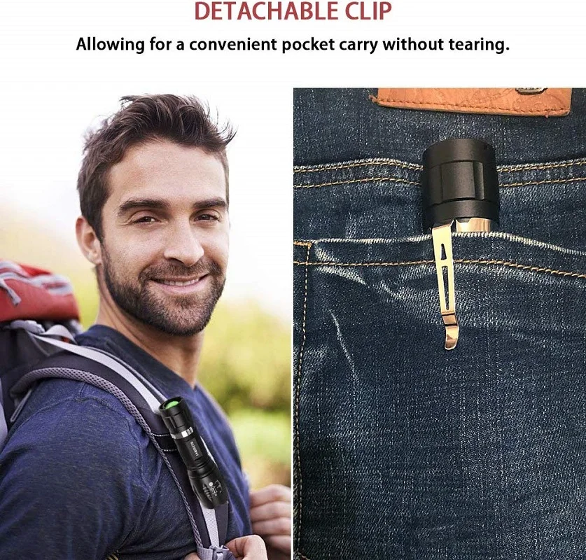 【 2 в 1 светодиодный фонарь с 4 моделями 】 4 режима светодиодный фонарик POCKETMAN: высокая яркость/Средняя яркость/Стробоскоп/ультрафиолет. Супер яркий светодиодный фонарь с масштабируемой функцией, создает идеальный сфокусированный прожектор с более длинным радиусом облучения (до 350 метров); Или Блестящий большой прожектор для более широкого обзора. Идеально подходит для улицы, ночного клуба, пешего туризма, рыбалки, велоспорта, альпинизма, кемпинга и барбекю.