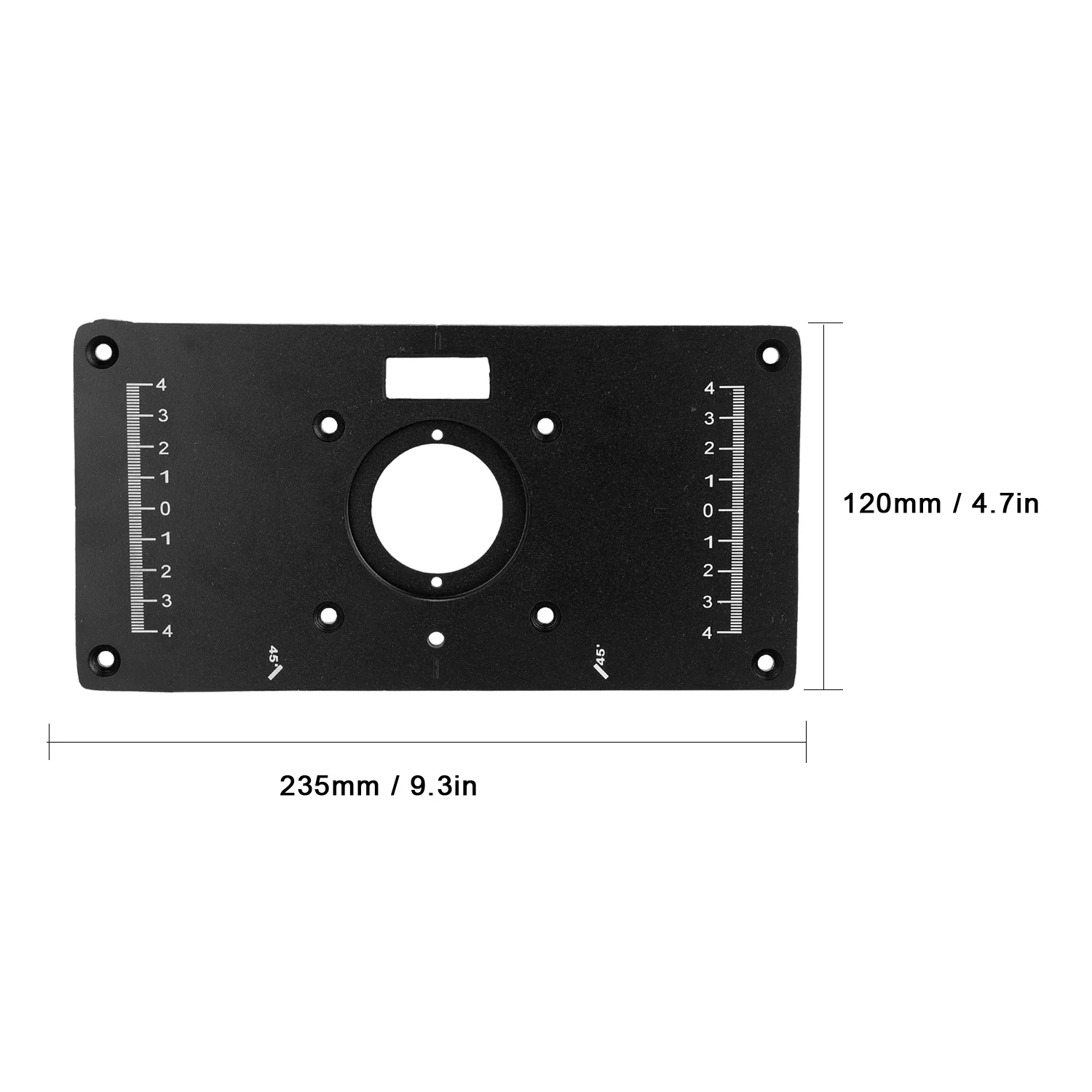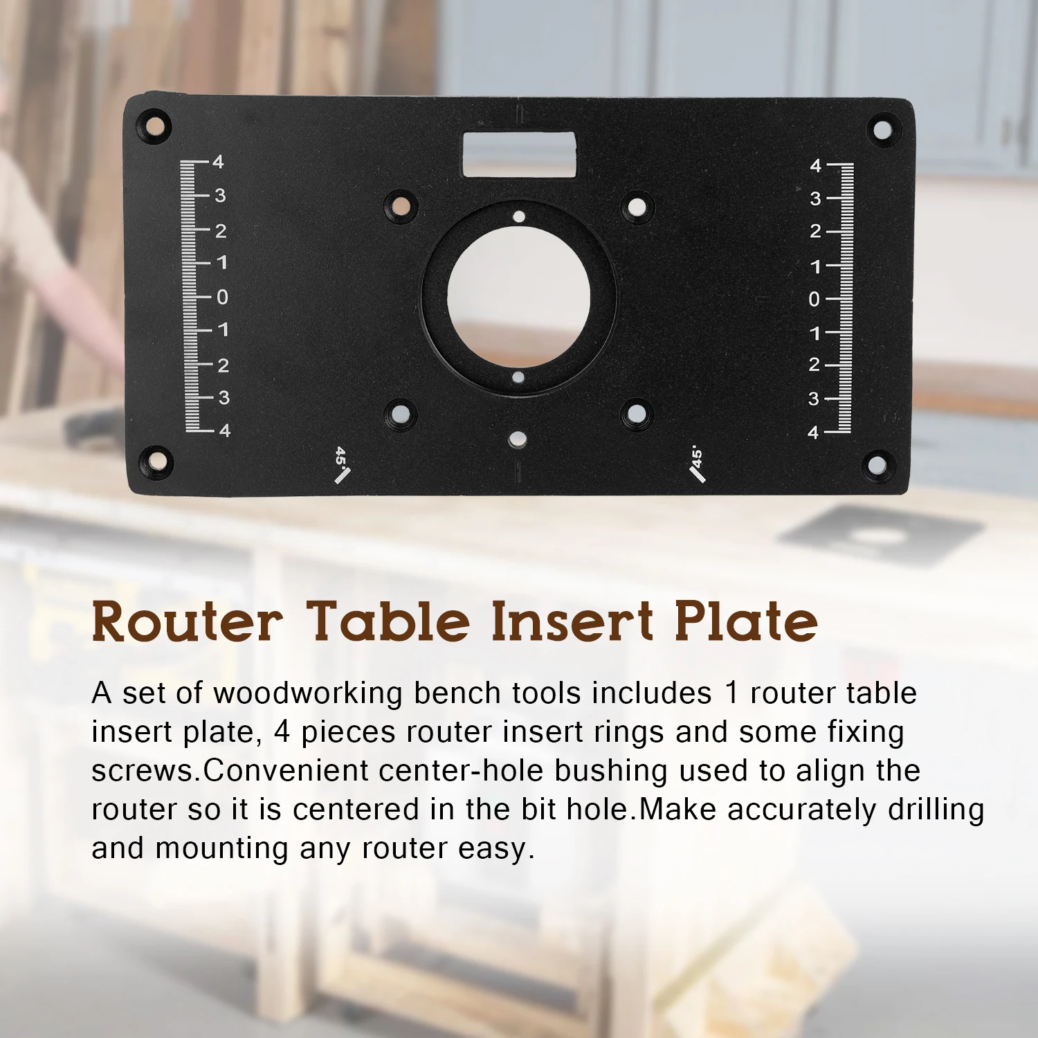 Набор инструментов для деревообработки включает 1 вставную пластину для стола маршрутизатора, 4 кольца со вставками и некоторые крепежные винты.