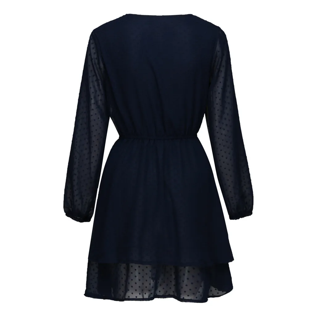 Women Ladies Round Neck Solid Cascading Lantern Sleeve Casual Mini Dress