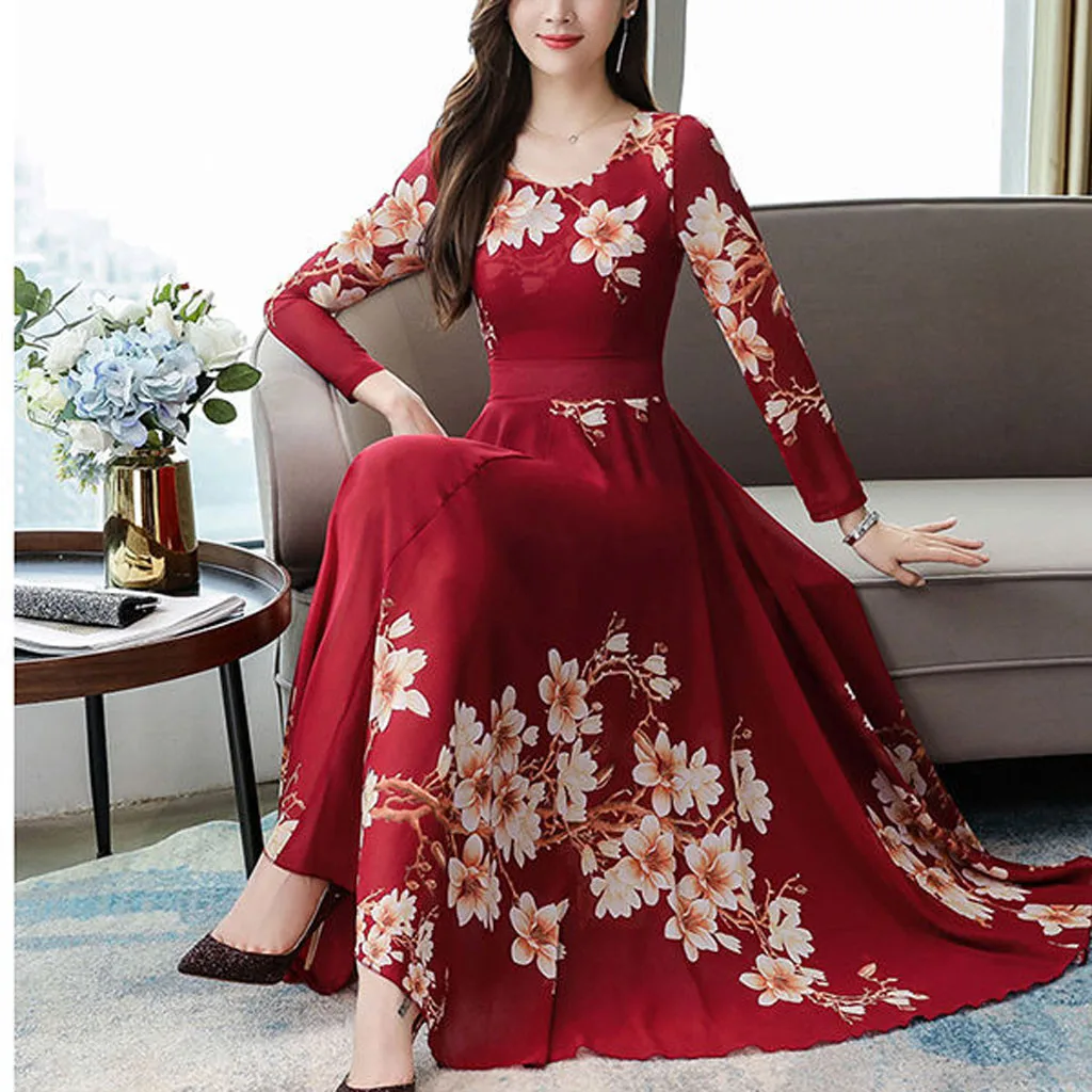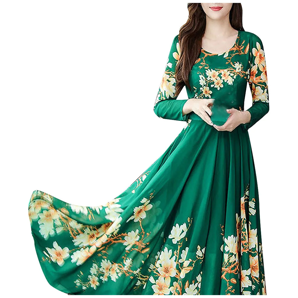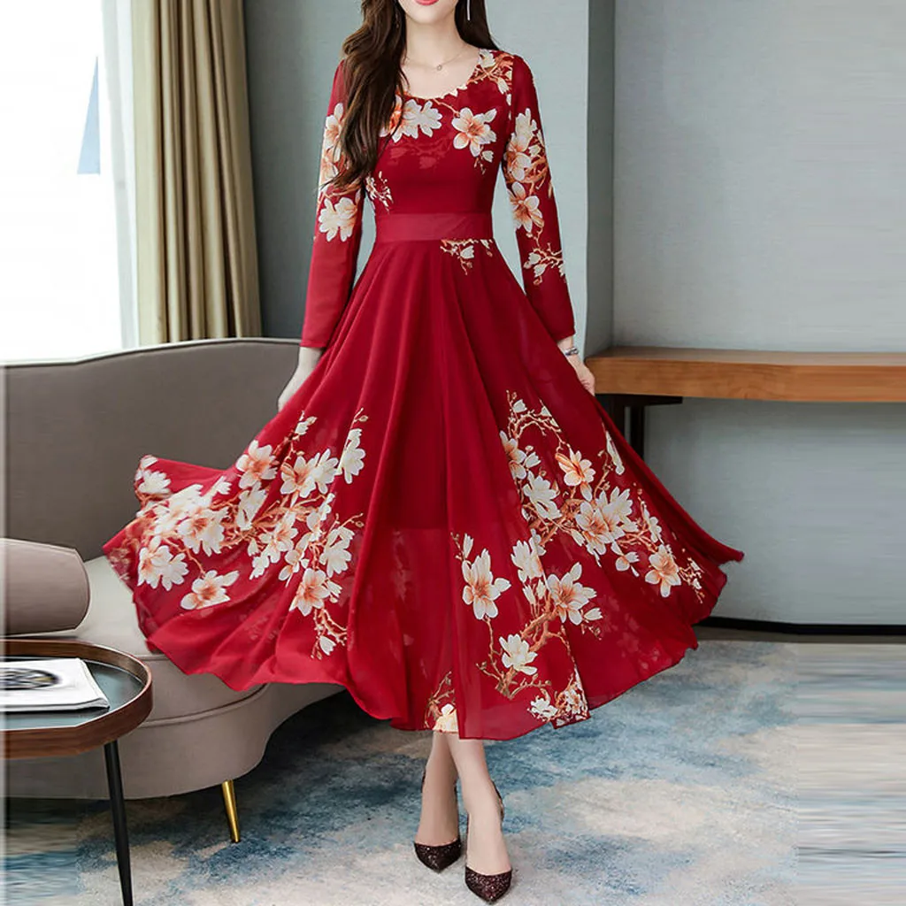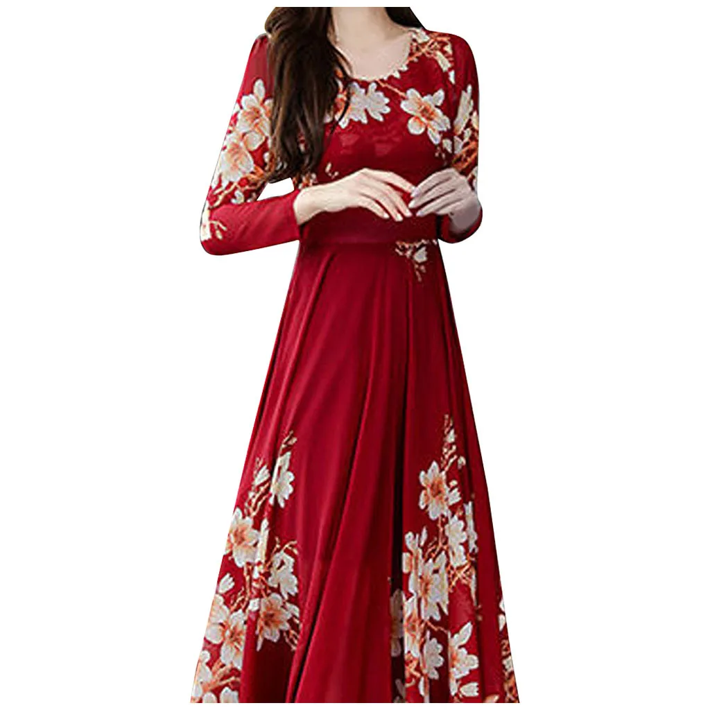 Женское платье с круглым вырезом, длинным рукавом и цветочным принтом, ТРАПЕЦИЕВИДНОЕ ПЛАТЬЕ