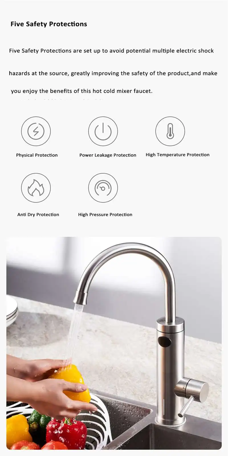 Пять защитных средств созданы для того, чтобы избежать потенциальной множественной опасности поражения электрическим током у источника, что значительно повышает безопасность продуктов и позволяет вам наслаждаться преимуществами этого смесителя горячей и холодной воды.