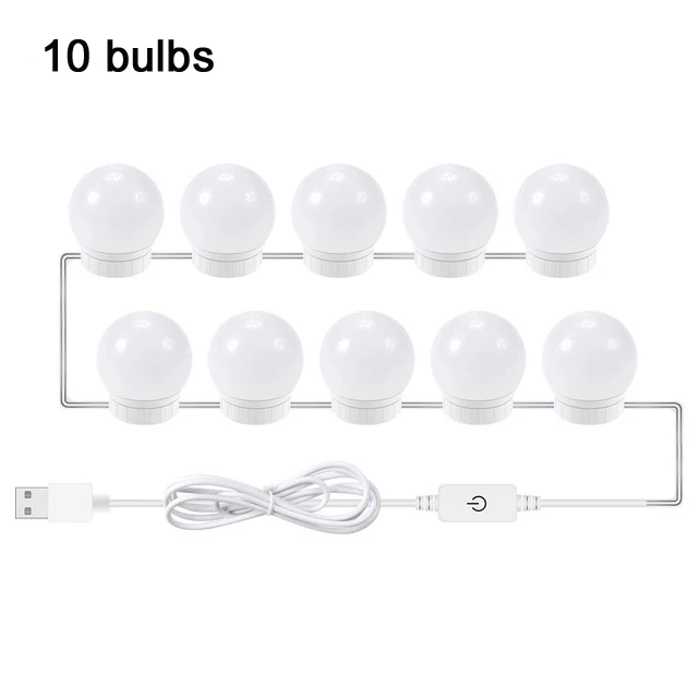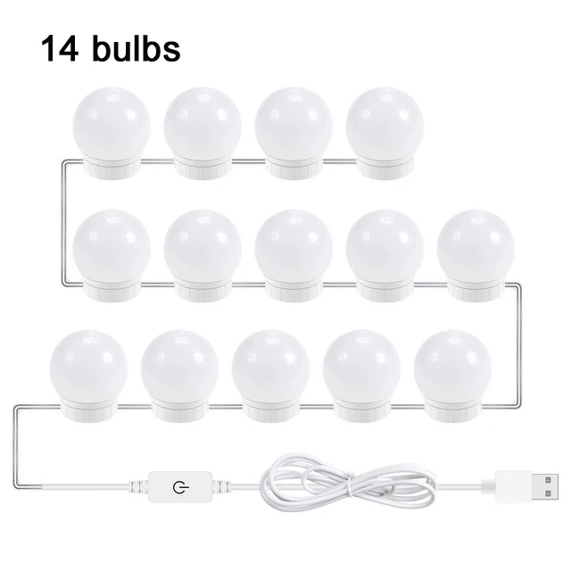 Характеристика: -Название продукта: светодиодный светильник -Материал: Поликарбонат -Входное напряжение: DC12V -Мощность: 8 Вт/12 Вт/16 Вт/20 Вт -Светильник; Цвет: натуральный белый -Цветовая температура: (3500-5500K) -Разъем: порт USB -Размер лампы: 3,2 см X 4 см X 4,8 см -Количество ламп: 2 шт./6 шт./10 шт./14 шт. -Расстояние между 2 лампами: около 33 мм -Диммируемая: Плавная диммируемая Описание: 1. С помощью USB линии, продукт может заряжать ваш телефон. 2. Светодиодный светильник обеспечивает профессиональный светильник для макияжа, он мягкий и не ослепительный, поэтому светильник не повредит вашим глазам, достаточный светильник позволяет не беспокоиться о разнице в цвете при макияже. 3. Вы можете настроить яркость, чтобы соответствовать вашим требованиям, 9 уровней яркости регулируется, 4. Поставляется с сильной адгезионной двусторонней лентой, лампы могут быть быстро закреплены как на глянцевых, так и на текстурированных поверхностях в течение нескольких минут. 5. Вы можете отрегулировать длину нити между каждой лампочкой, чтобы соответствовать вашему размеру зеркала.