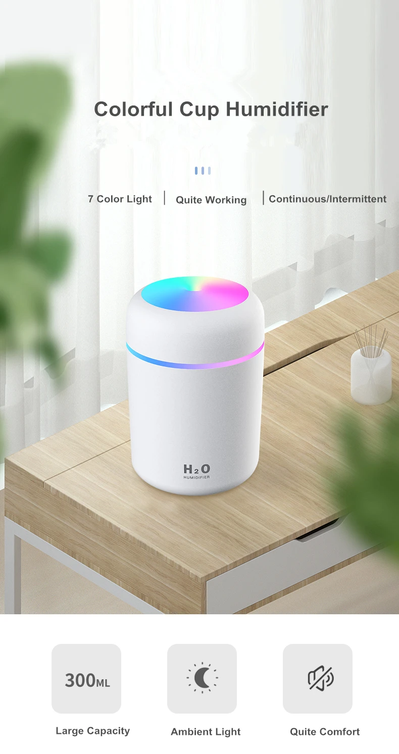 Товары: Наименование товара: цветной ультразвуковой увлажнитель воздуха Материал: АБС + ПП + силикон + электронная часть Резервуар для воды: 300 мл (до 10 часов работы) Размер продукта: 78*78*120 мм Цвет изделия: белый/розовый/темно-синий Мощность: 2 Вт Выход тумана: 20-40 мл/ч Напряжение: DC5V Таймер: 4-6 ч Особенности: 1. Романтический Красочный Радужный светильник соответствует мини-размеру для автомобильного держателя 2. Увлажнитель непрерывный туман 4 часа таймер, прерывистый 6 часов Таймер 3, красочный дизайн чашки отлично подходит для домашнего офиса автомобиля 5, тяжелый туман с ультра-довольно дизайном