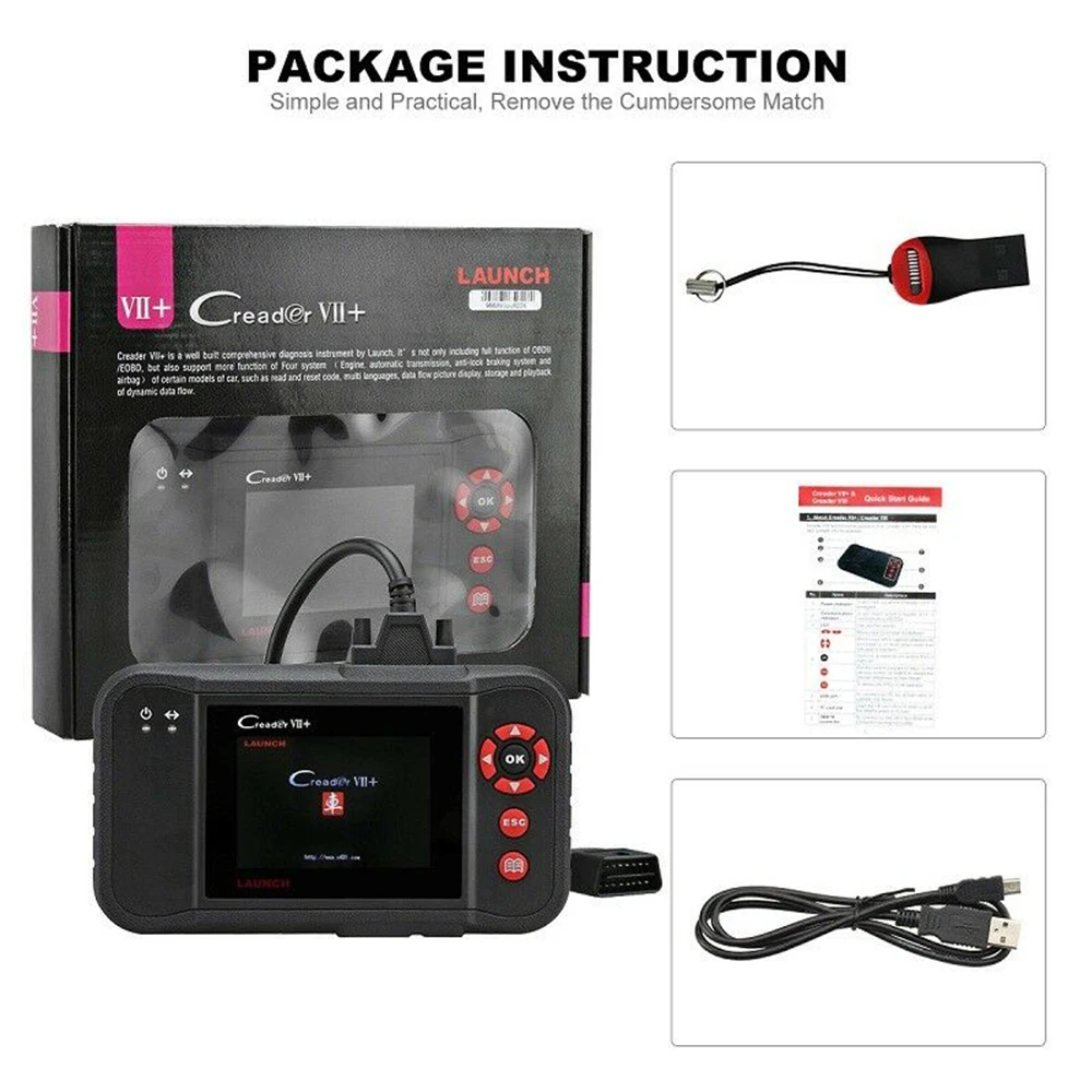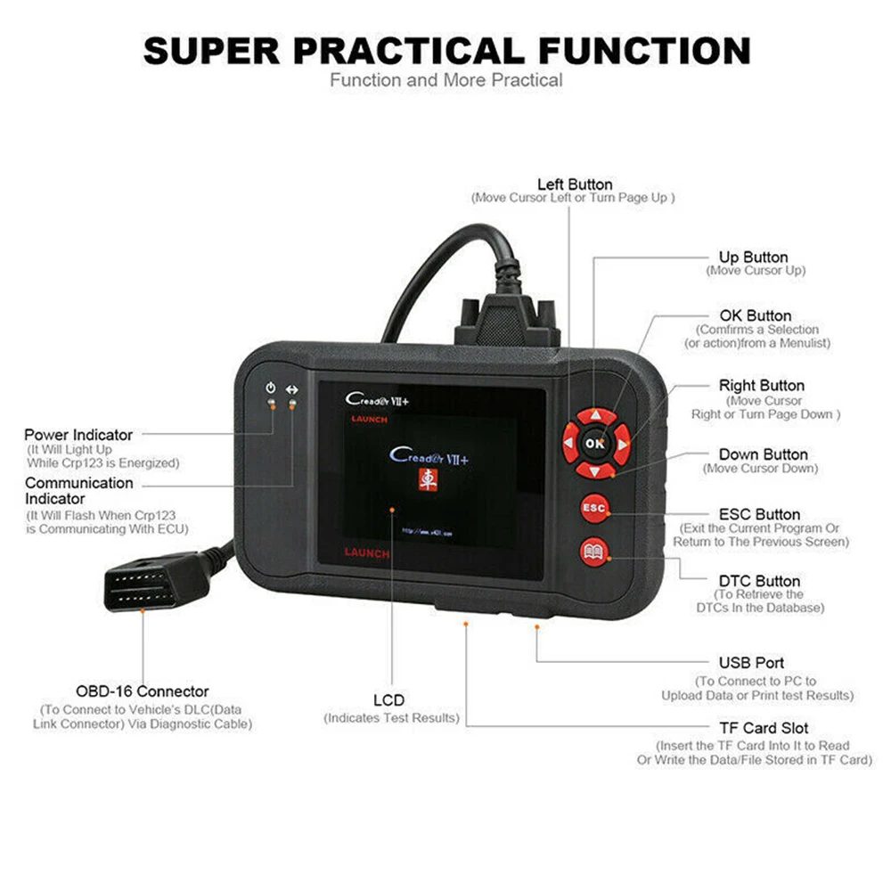 Creader VII + (launch CRP123)-это хорошо построенный комплексный диагностический прибор с запуском. Это не только включает полную функцию OBDII/EOBD, но и поддерживает больше функций четырех систем (двигатель, автоматическая коробка передач, Антиблокировочная тормозная система и подушка безопасности) основных моделей автомобилей, например, чтение и сброс кода, многоязычный, графический дисплей потока данных, хранение и воспроизведение динамического потока данных и т. Д.