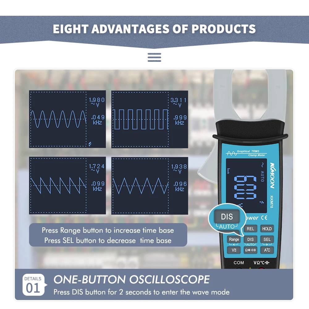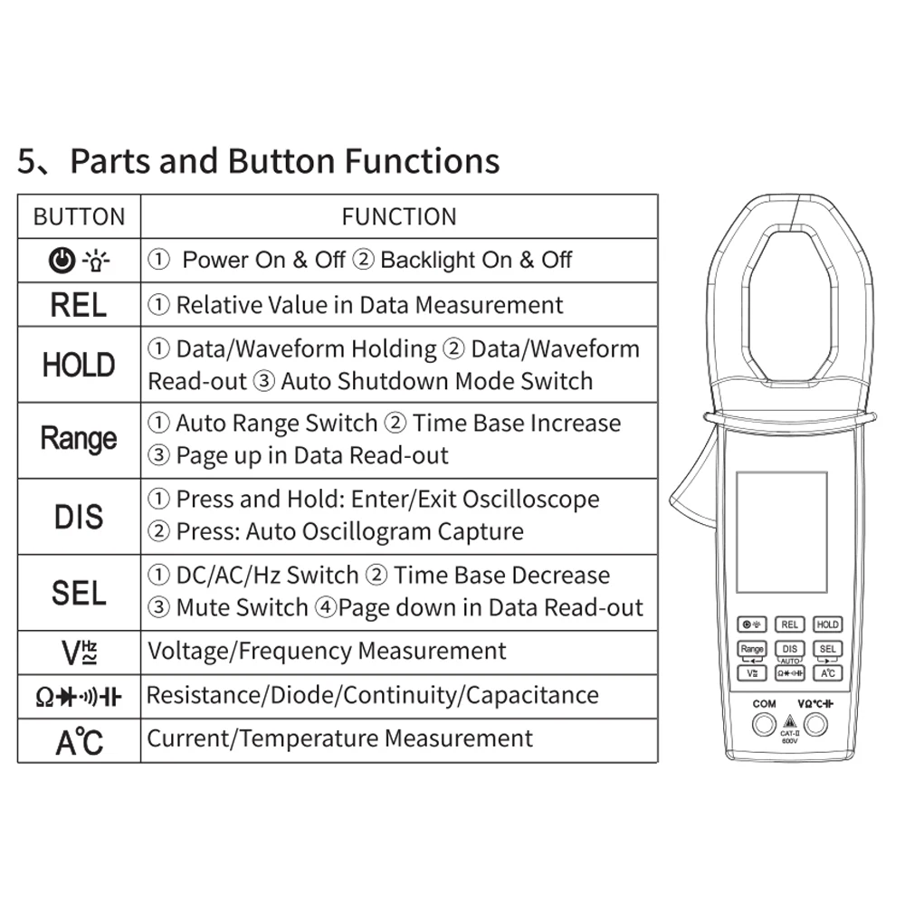 Это Автоматический диапазон TRMS зажим-тип отображения формы волны, контролируется DSP и имеет функции осциллографа, постоянного/переменного напряжения, переменного тока, сопротивления/диода/ВКЛ-ВЫКЛ, емкость, частота, измерение температуры и т. д. и имеет функцию измерения относительного значения.