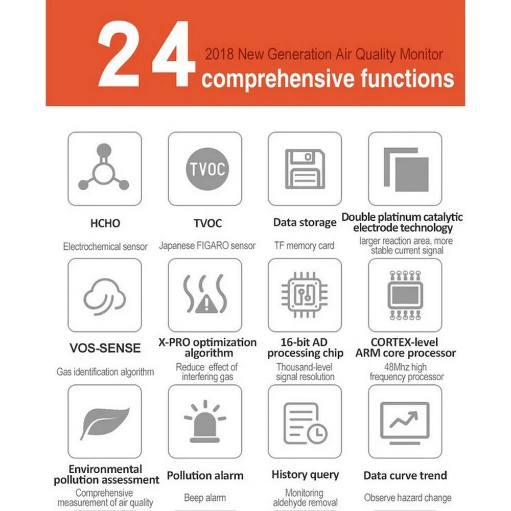 ① Основные характеристики: отображение номера частиц/детекция формальдегида/Обнаружение ЛОС/системное время/внешний TF/функция хранения
