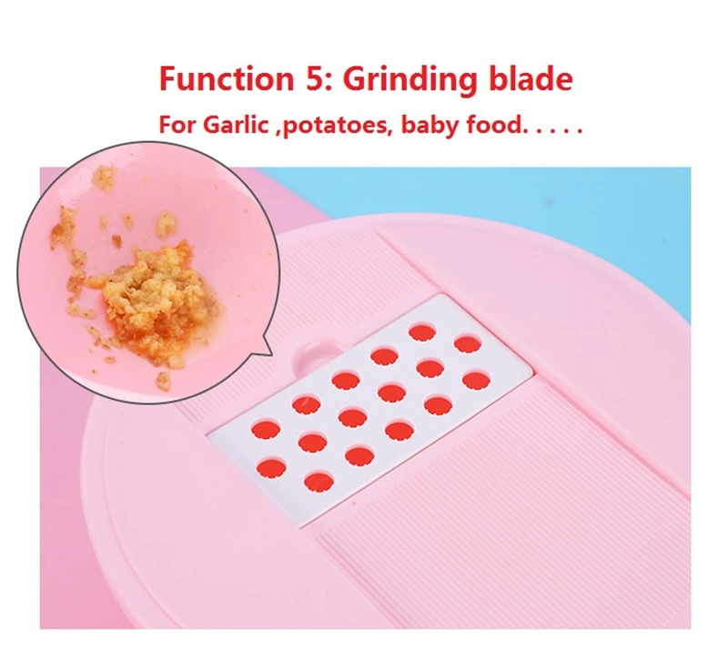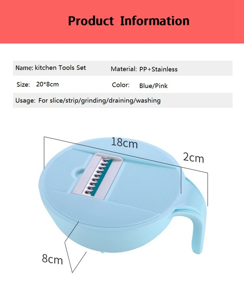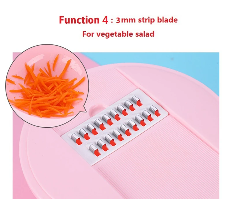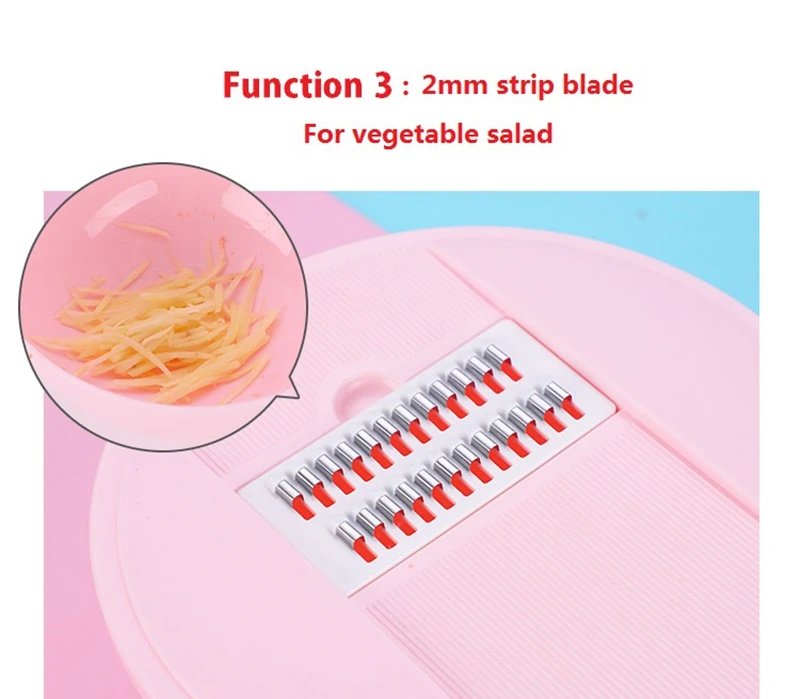 Название продукта: овощерезка Цвет: синий/розовый Основной материал: ПП + абс + нержавеющая сталь Преимущества продукта: 1. Высококачественный материал: Этот мандолиновый слайсер изготовлен из пищевого материала, безопасный, здоровый и прочный. 2. Разумный дизайн: удобная ручка, устойчивое дно, более удобное в использовании. 3. Многофункциональный: 6 видов функций (слайсер/2 зубчатая терка/гиндер/лезвие картофельных чипсов/корзина для слива/Мойка 4. Легко чистить: его можно очистить водой или чистящей прокладкой. 5. Применение: кухня/на открытом воздухе. . .