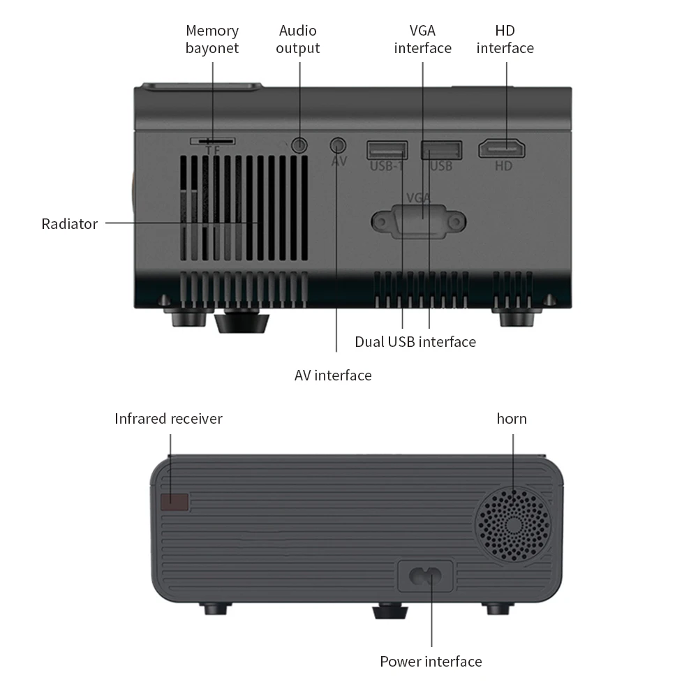 Входной интерфейс: AV вход, USB вход, TF карта чтения вход. Вход HDMI, вход VGA