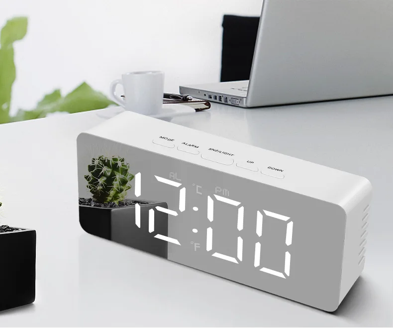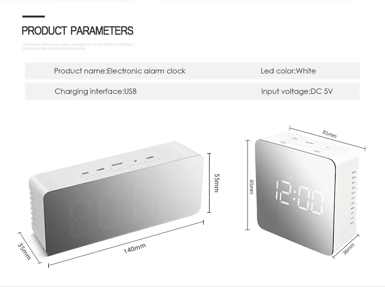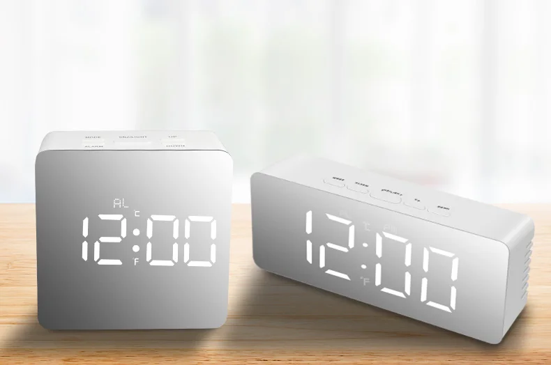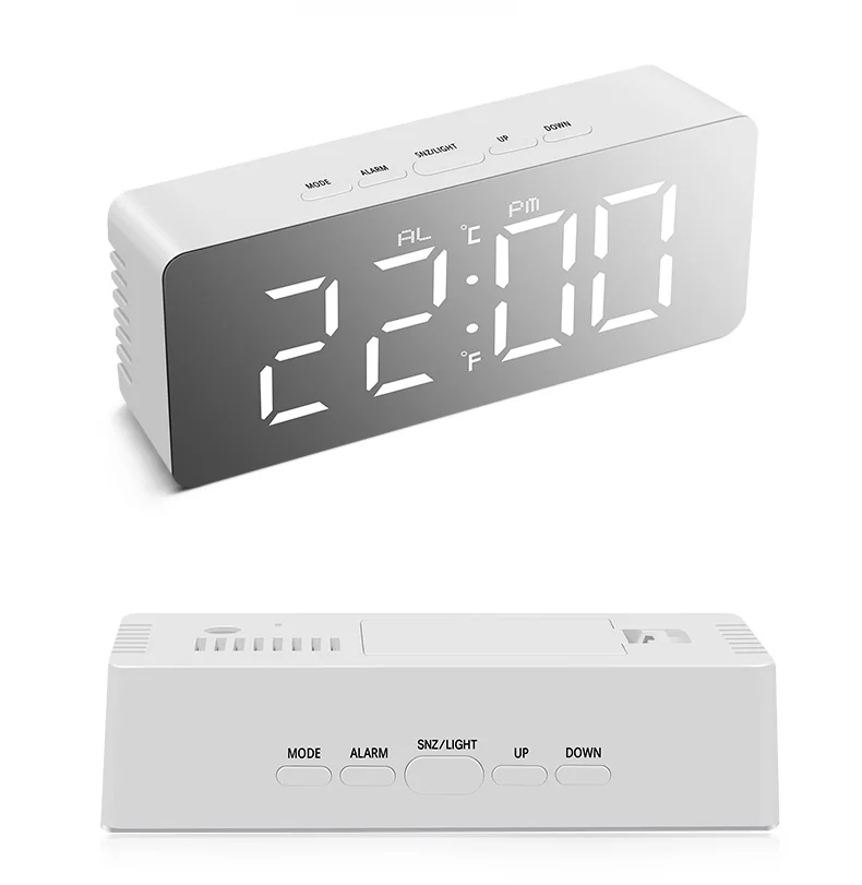 1. Светодиодный экран-не только для отображения времени, но и для нанесения макияжа. 2. Температурный режим (°C или °F) на выбор: встроенный температурный датчик, займет некоторое время, чтобы отобразить соответственно температуру в помещении. 3. Функция повтора: интервал повтора может быть установлен от 5 до 60 минут, как вам нужно. 4. Время (AL / PM): большой дисплей с 12-24 часовым выбором формата. 5. Легкий набор: с пяти функциональными кнопками (режим, будильник, Snz/светильник, вверх, вниз). Длительное нажатие или короткое нажатие кнопок для установки. 6. Подходит: домашняя спальня, прикроватная тумбочка для офисного стола