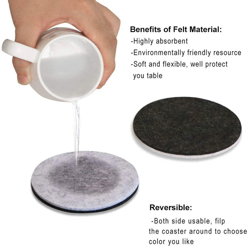 Большая Абсорбция: Изготовлен из премиум войлочного материала, который имеет сильную абсорбцию, мягкий и светильник вес особенности, 4 дюйма набор подставок под напитки может впитывать любую жидкость даже пятна на столе гораздо лучше, чем каменные или пробковые подставки, хорошо защитит вашу мебель от влаги.