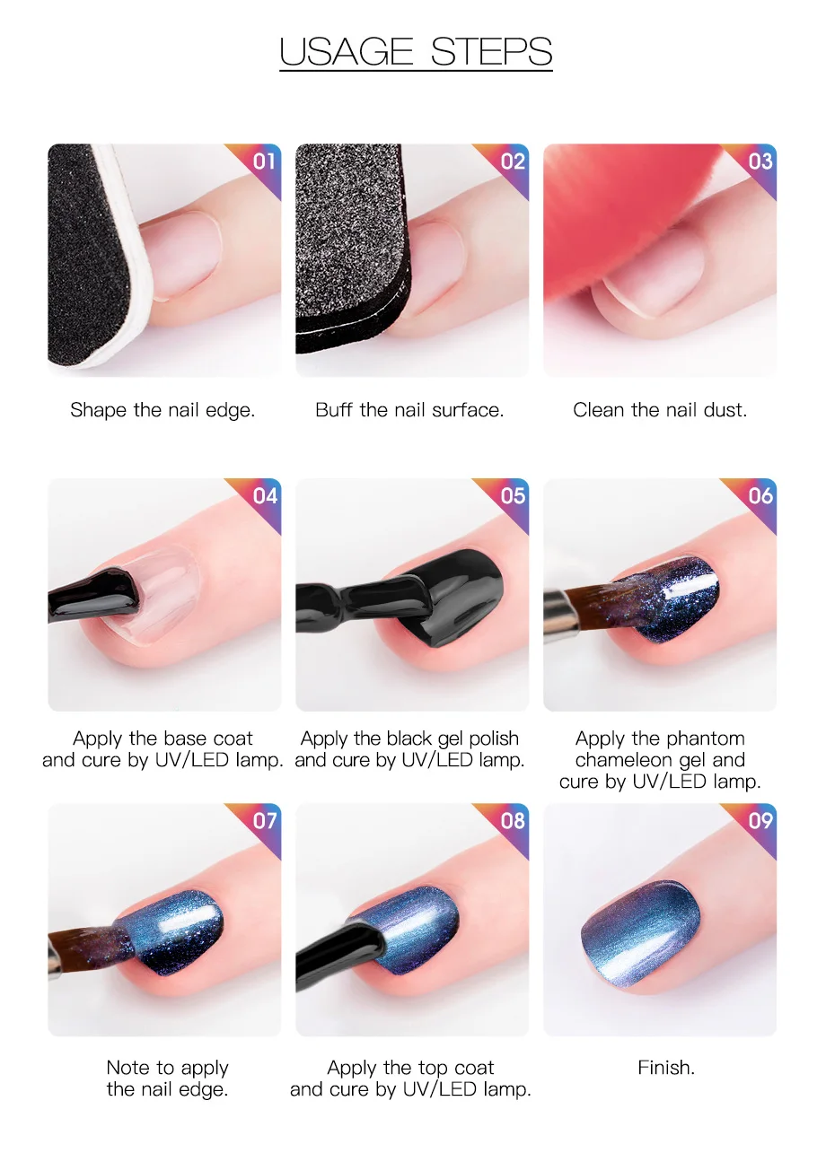 -1. Форма ногтя. Слегка смочите поверхность ногтевой пластины. Дезинфицировать. -2. Нанесите базовый слой основы от кутикулы до свободного края (не забудьте запечатать край ногтя). Высушите ногти под светодиодный светильник в течение 10 секунд или УФ-светильник в течение 2 минут. -3. Нанесите тонкое пальто отмачиваемого геля на выбор. Свободный край крышки. Лечение: 30 секунд в светодиодный светильник, или 2 минуты в УФ-лампе. -4. Повторите 2-е тонкое покрытие отмачиваемого гель-лака на ногти. Высушите под светодиодный лампой в течение 30 секунд или УФ-светильник в течение 2 минут. -5. Нанесите верхнее пальто. Свободный край крышки. Лечение: 30 секунд в светодиодный светильник. -6. Удалите липкий остаток на ногтях с помощью очищающего средства. Затем нанесите питающее масло кутикулы для увлажнения влаги в кутикулу и кожу вокруг ногтя.
