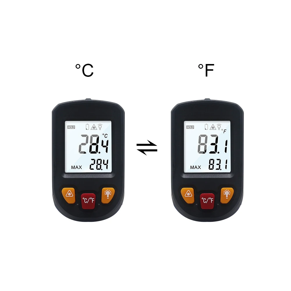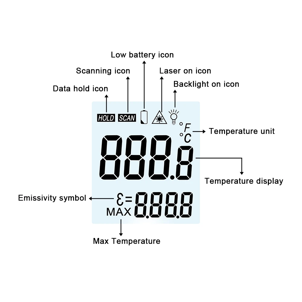 • Индекс преломления регулируется: 0,95 Предустановленная, 0,10 ~ 1,00 регулируемая (длинное нажатие кнопки °C/°F для изменения излучательной способности)