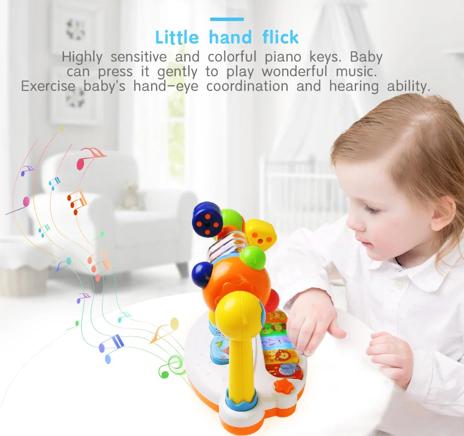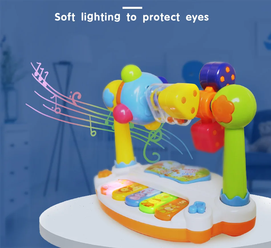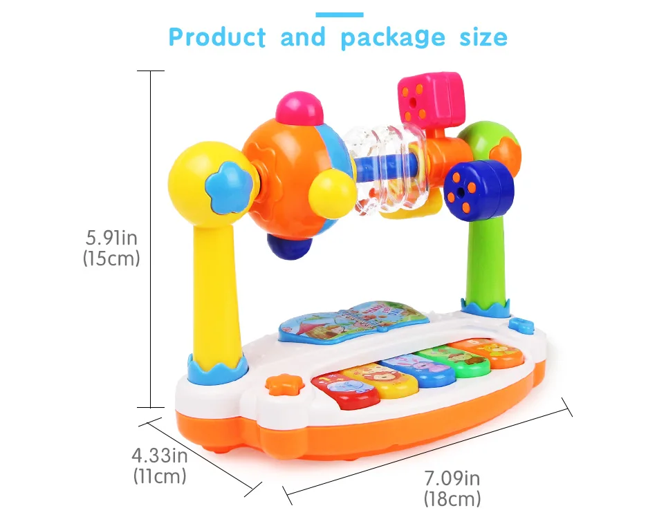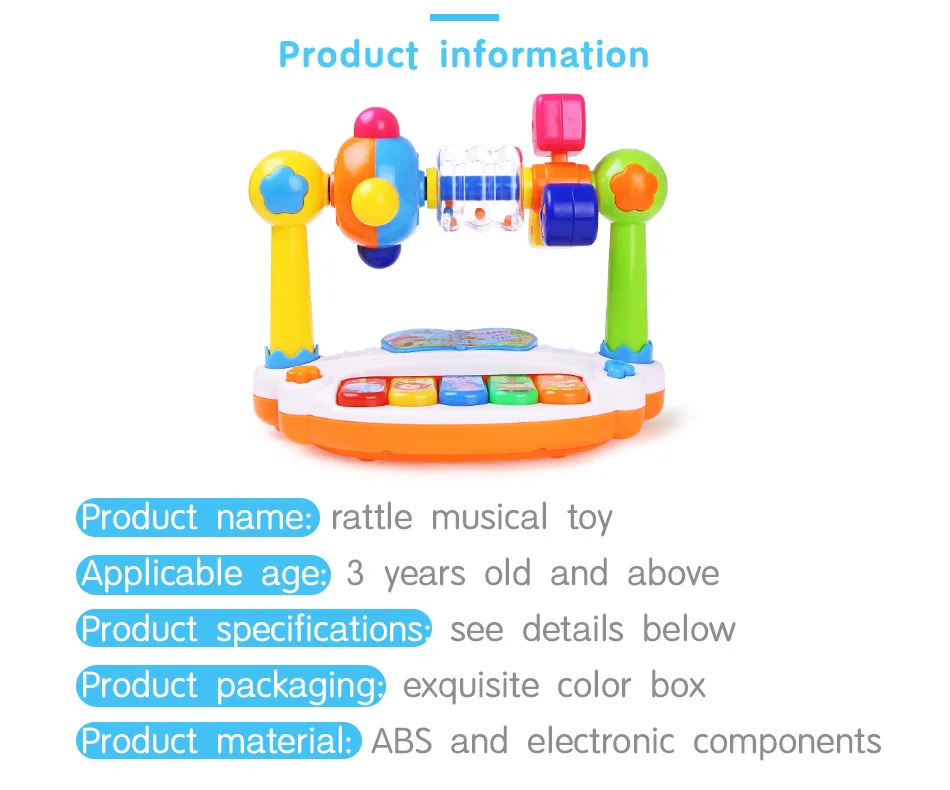 -Милая форма с ярким цветом и приятным звуком, которая привлечет внимание вашего ребенка. -Внутри есть цветные бусины, которые издадут шуршливый звук, и тренируют координацию рук и глаз ребенка, развивая слуховые ощущения ребенка. -Ребенок может поворачивать различные формы путем набора верхнего компонента, который может способствовать сенсорному развитию и распознаванию различных форм.