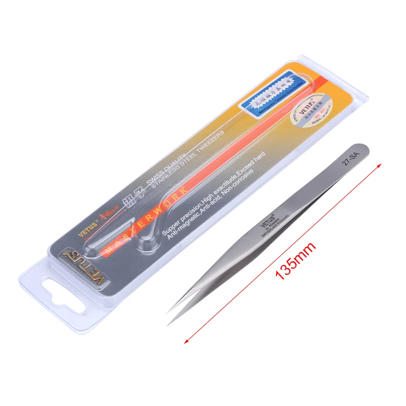 Особенности: 1. Оригинальный VETUS 2. Изготовлен из высококачественной нержавеющей стали; 3. Немагнитный, супер-жесткий (HRC45) хорошо стойкий. 4. Различные ощущения в процессе и внешний вид, тонкий кончик головы, и может держать 0,01 мм предмет, и прочный и не легко деформируется. 5. Модель: 1-SA 3-SA 4-SA 5-SA 7-SA 5A-SA 5B-SA 6A-SA 27-SA 3C-SA 00-SA AA-SA SS-SA 2A-SA 6. Изысканная упаковка. Применение: косметика, электроника, часы, ювелирные изделия, химикаты, лаборатория, высокотехнологичные цифровые камеры, мобильные телефоны, медицинские и так далее.