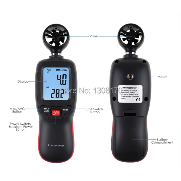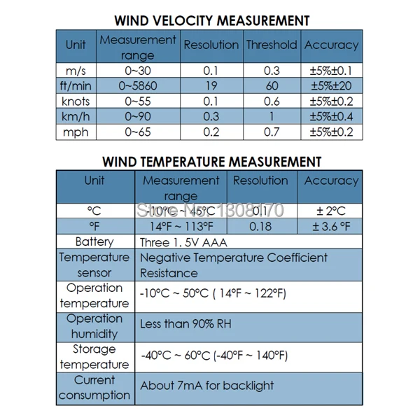 Диапазон измерения: 0 ~ 30 м/с, 0 ~ 5860 футов/мин, 0 ~ 55 узлов, 0 ~ 90 км/ч, 0 ~ 65 миль/ч