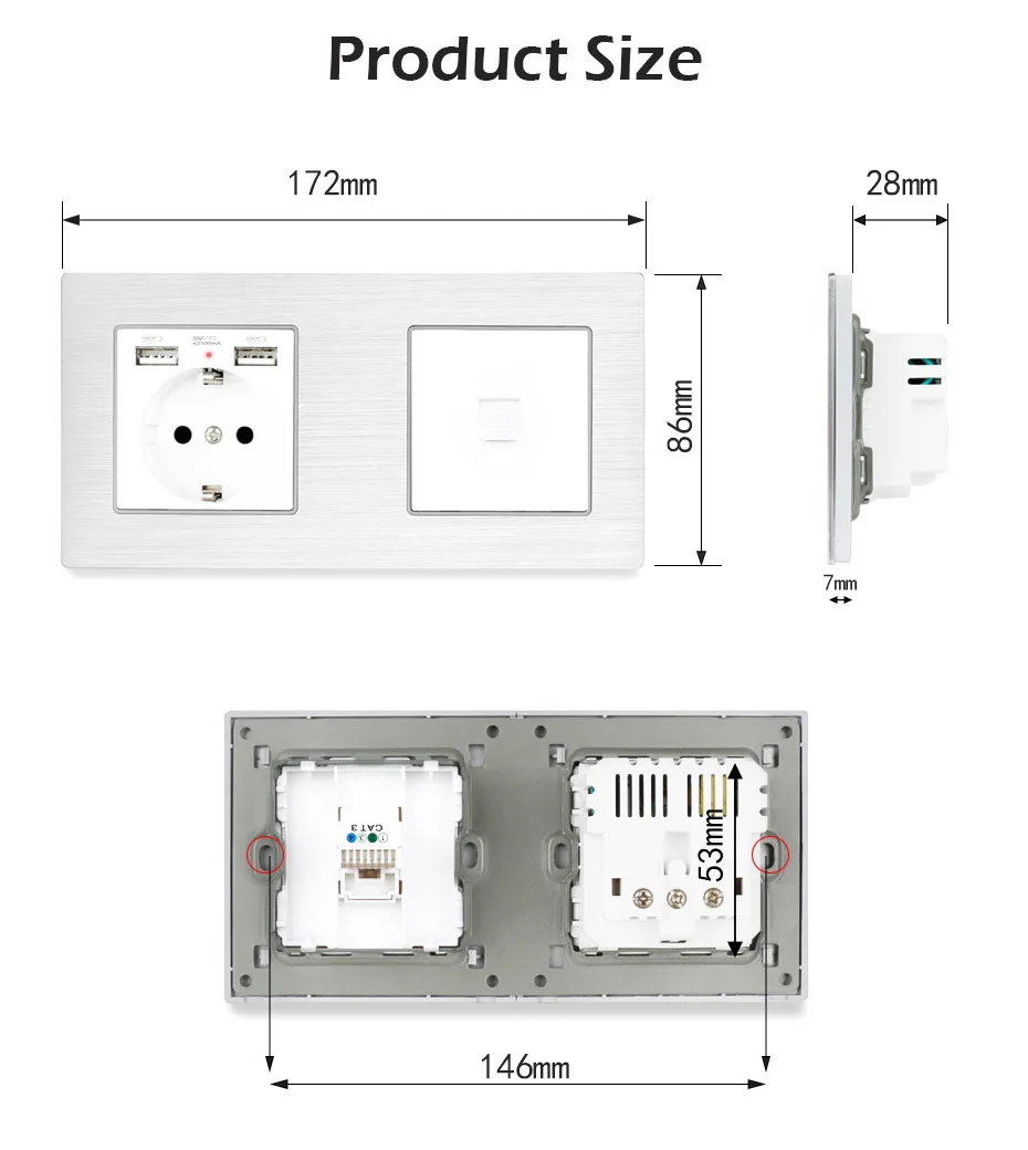 Esooli алюминиевая металлическая настенная розетка стандарта ЕС заземленная с 2 usb-портом для зарядки скрытый мягкий светодиодный + 1 банда RJ11 телефонный разъем