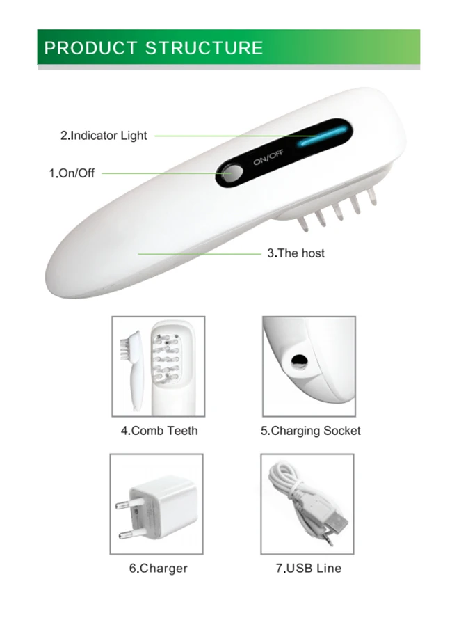 2. Три группы лазера с 15 отверстиями, активирует волосяной фолликул, микро-вибрационный массаж, снимает кожу головы