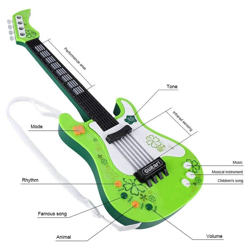 Уникальный дизайн: дизайн инфракрасного датчика приносит много удовольствия детям. Высококачественные объемные звуковые эффекты создают пространственное стереополе для детей. Мягкая и красочная вспышка может легко привлекать внимание детей, не нанося вреда их глазам. Подходит для детей старше 3 лет. 4 режима: гитара имеет 4 режима, нормальный режим, музыкальный режим, режим инструмента и режим знаменитой песни. Вы можете быстро переключиться в режим, который нравится вашему ребенку.