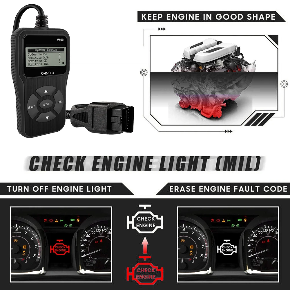Функция диагностического сканера Full O-B-D II --- считывание и стирание кода неисправности двигателя; Просмотр данных о замораживании кадра; получение состояния готовности I/M; просмотр информации о транспортном средстве; выход из O-B-D 2 теста и т. Д. удобно для вас, чтобы узнать статус вашего автомобиля в реальном времени без похода в автомастерскую.