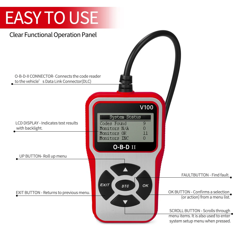 Современный дизайн --- этот мини портативный читатель кода Особенности Большой легко читаемый освещенная контржурным светом ЖК-дисплей экран, многоязычное меню и определения кода и стандартный 16-контактный диагностический O-B-D-II разъем; никаких дополнительных кабелей не требуется.
